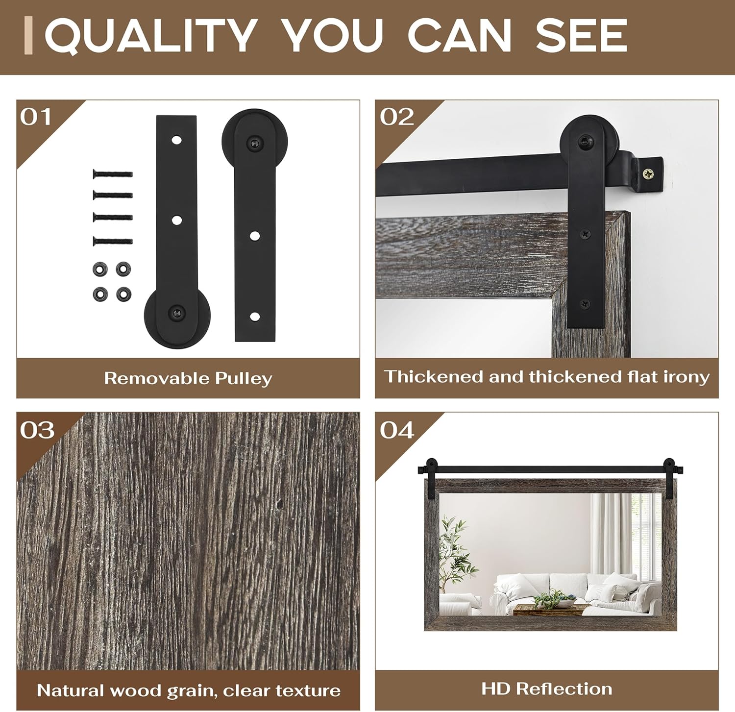 - QUALITY MATERIALS: The frame of the barn door mirror consists of an antique solid wood frame and a sturdy metal bracket. The interior features a 4mm HD silver mirror with clear and distortion-free reflections, providing a better sense of light and projection in your space