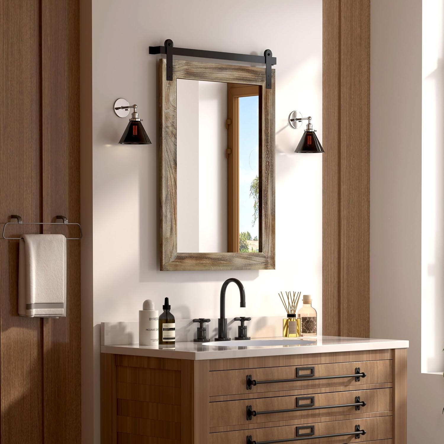 - EASY TO INSTALL: The overall size of this rustic mirror is 29.9 x 21.2 x 0.67 inch, and the display size of the mirror is 22.8 x 15 inch. The track is 21.2 inch. You can first fix the iron bracket on the mirror, then install the track on the wall, and finally the wheels on the iron bracket will be stuck into the track to complete the hanging
