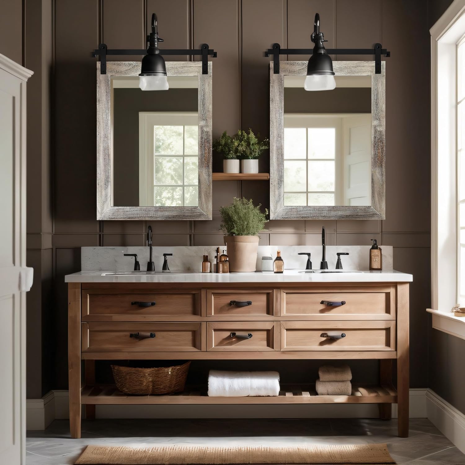 - VINTAGE DESIGN: This farmhouse mirror was inspired by a barn door and designed. It is a perfect combination of rustic and industrial style, which can make your home warm and inviting with the atmosphere of a farmhouse