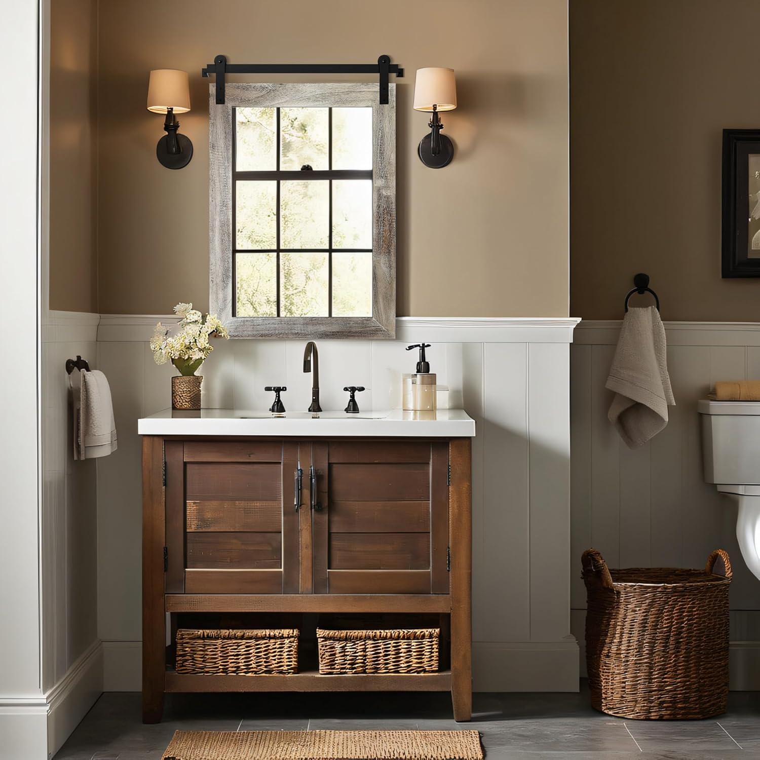 - QUALITY MATERIALS: The frame of the barn door mirror consists of an antique solid wood frame and a sturdy metal bracket. The interior features a 4mm HD silver mirror with clear and distortion-free reflections, providing a better sense of light and projection in your space