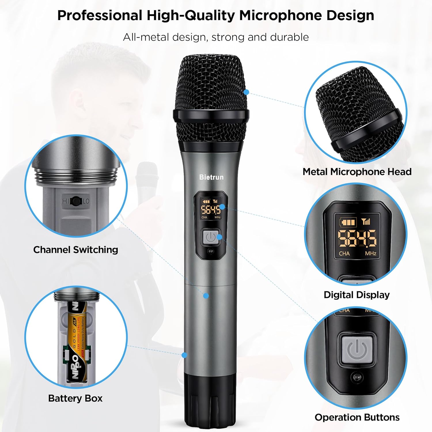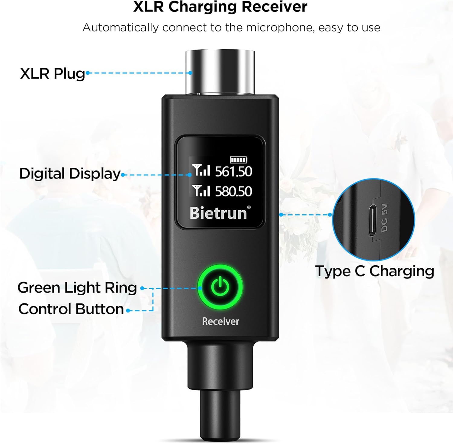 Bietrun XLR Wireless Microphone, UHF Dual Handheld Dynamic Metal Mic Set with Rechargeable Receiver, XLR to 1/4'' Adapter, for Karaoke, Church, Wedding, Party Singing(160 ft Range)(Auto Connect)
