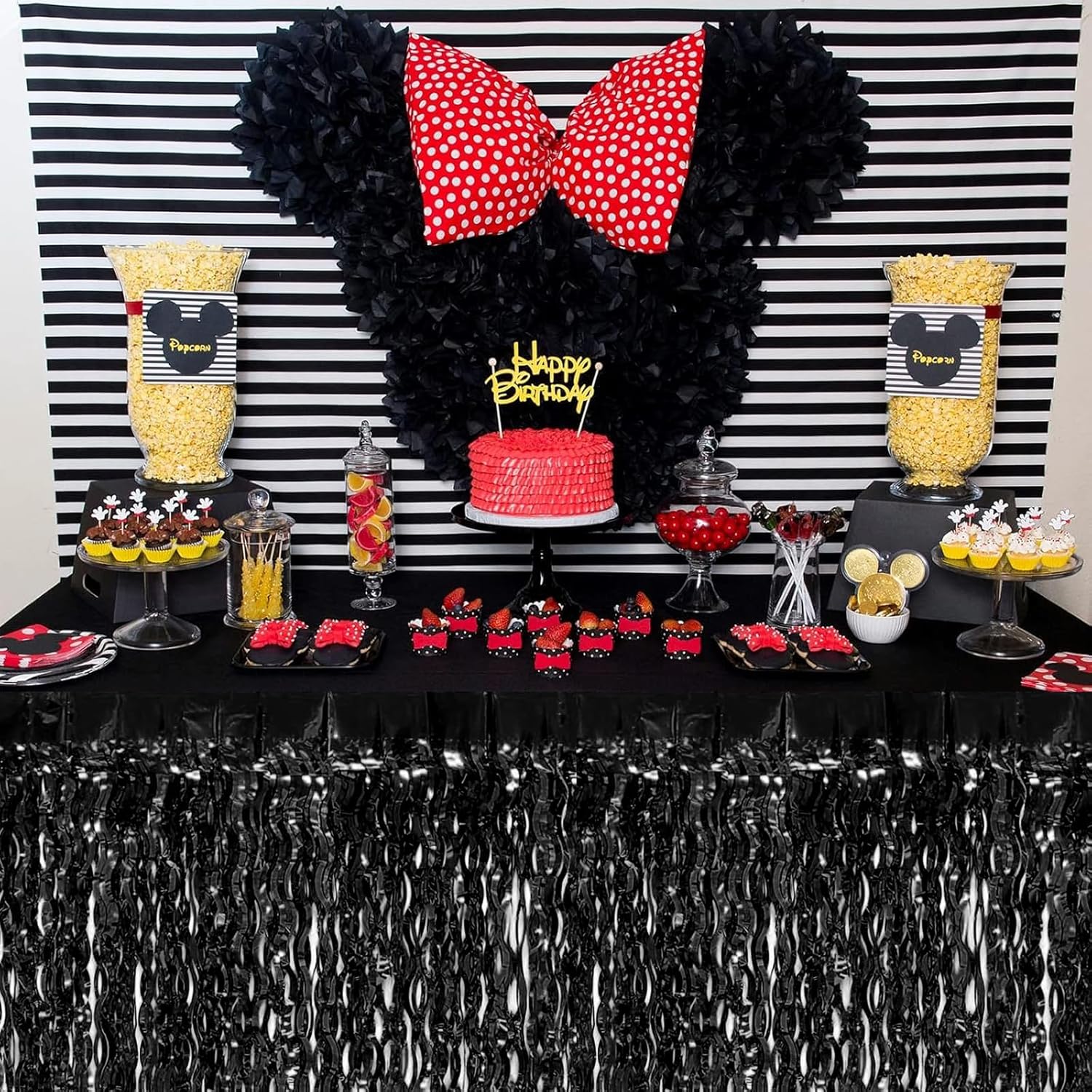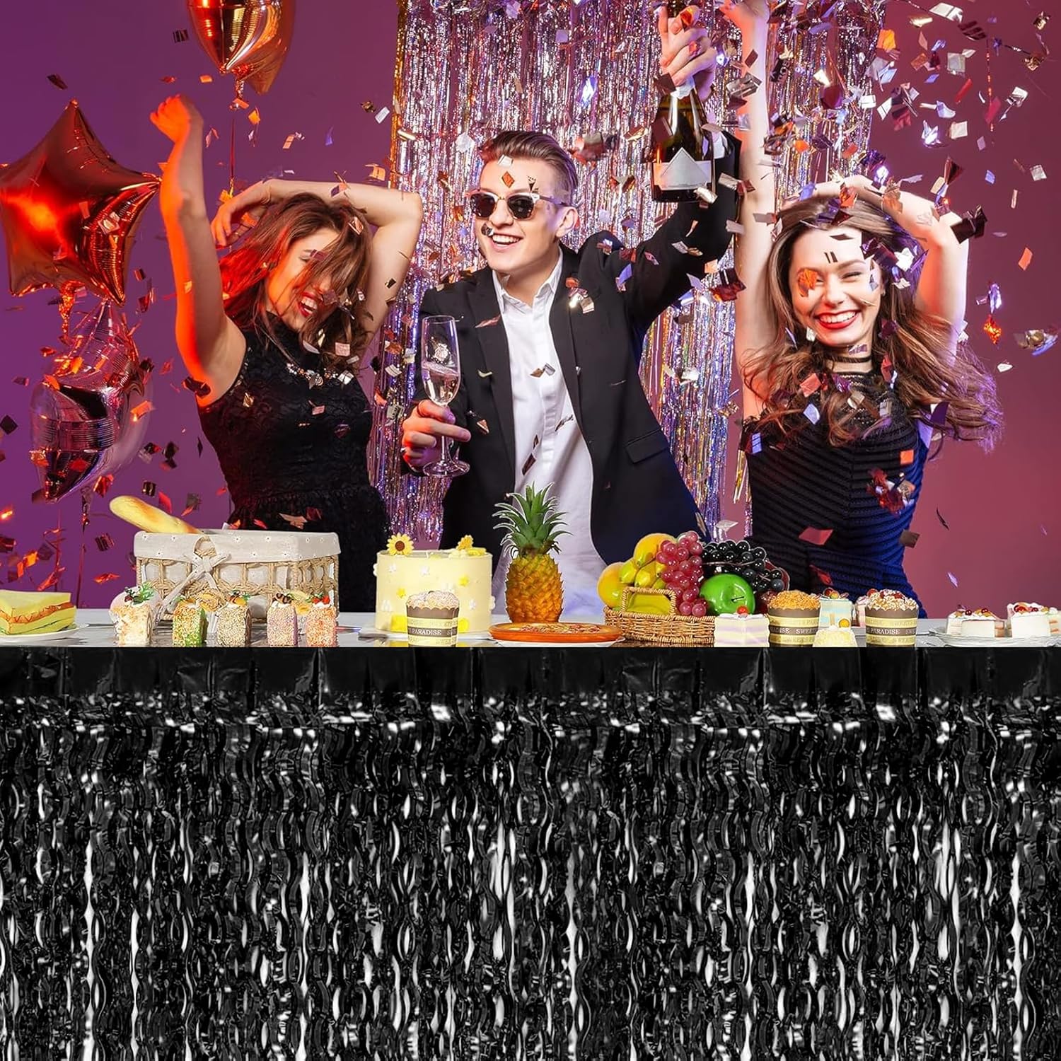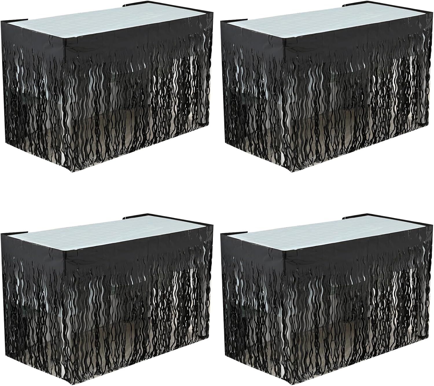 4P Wavy Metallic Tinsel Foil Fringe Table Skirts for Rectangle Tables Backdrop Garland Curtains for Parade Floats Wedding Birthday Parties Decoration Graduation 2025 Christmas (Black)
