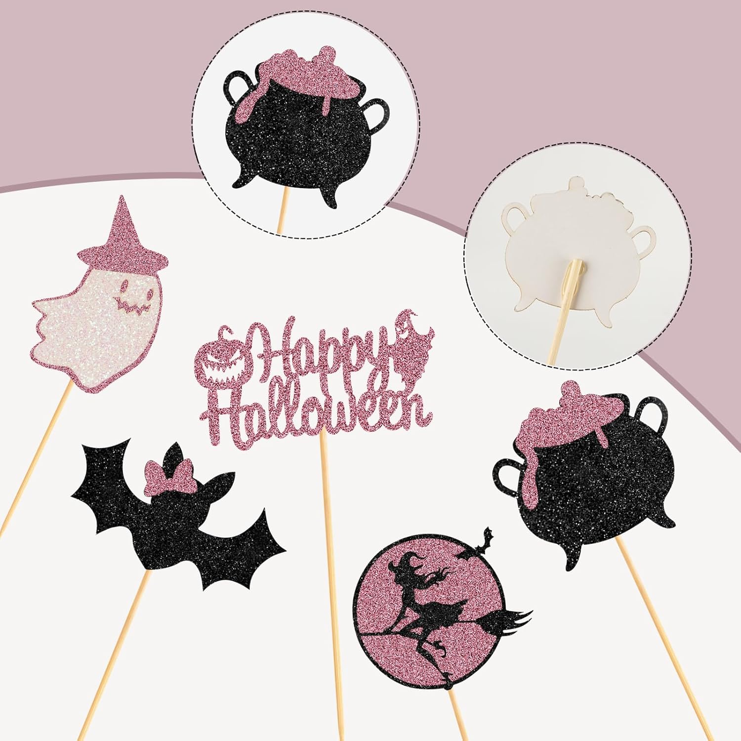 60Pcs Halloween Cupcake Toppers, Bat Pumpkin Ghost Cupcake Decorations for Halloween Party Supplies,Pink Multi Style1