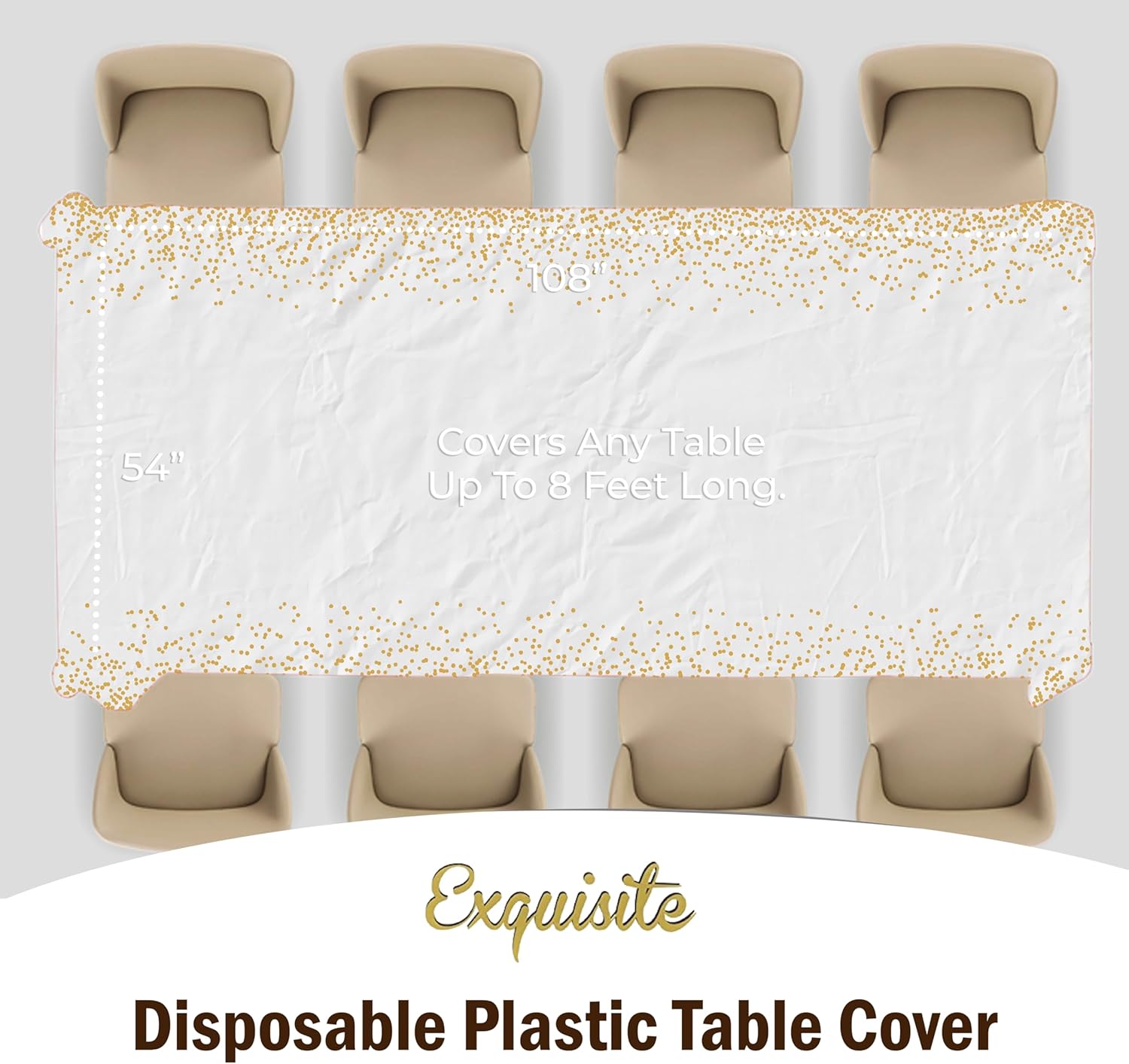 - INCLUDES: 12 heavy duty disposable White with Gold Dots plastic table cloth that will cover your table for protection and is great for homes with children, kitchen tables, dinning tables, dinners, family outings. bbq's and more!!!