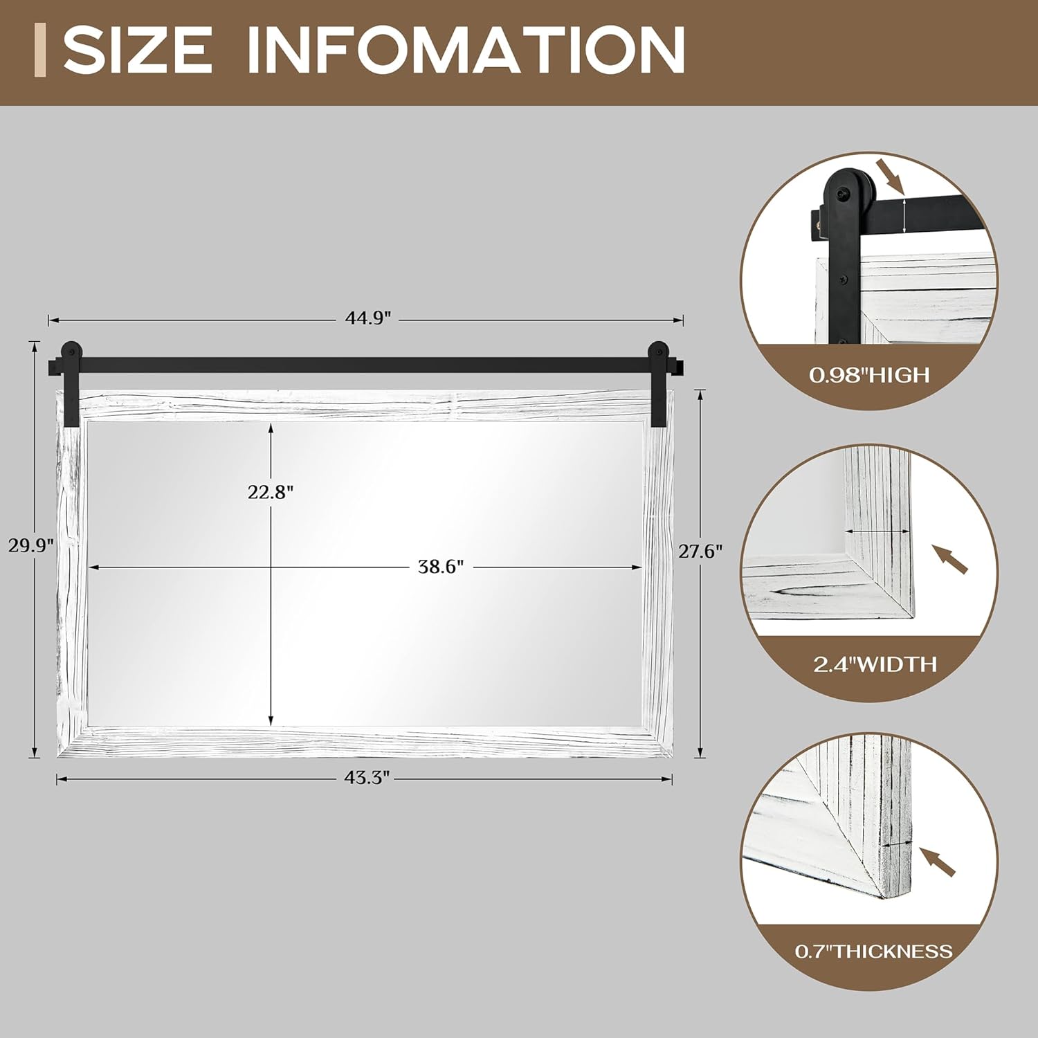 - EASY TO INSTALL: The overall size of this rustic mirror is 44.9 x 29.9 x 0.7 inch, and the display size of the mirror is 38.6 x 22.8 inch. The track is 45 inch. You can first fix the iron bracket on the mirror, then install the track on the wall, and finally the wheels on the iron bracket will be stuck into the track to complete the hanging