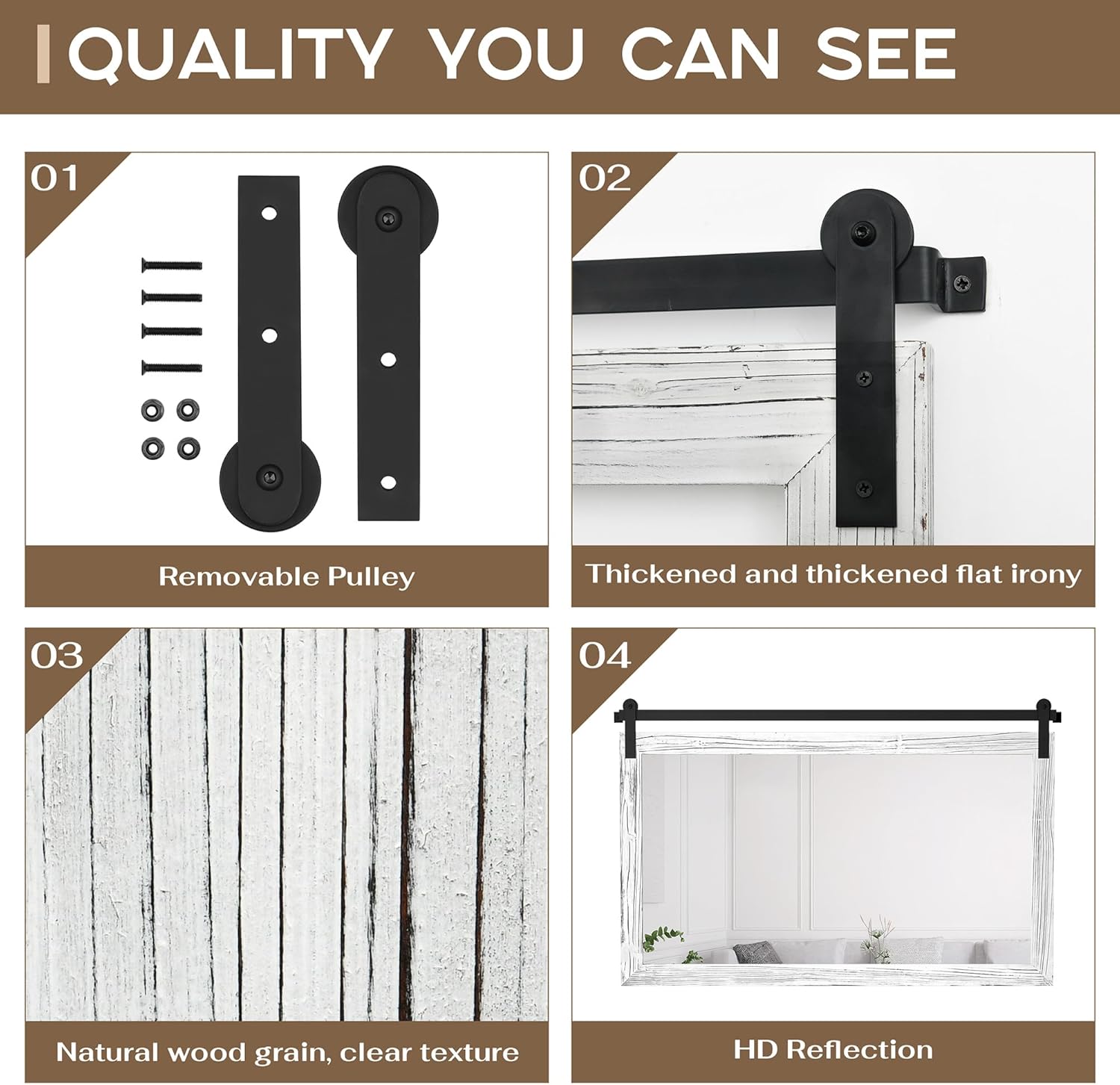 - QUALITY MATERIALS: The frame of the barn door mirror consists of an antique solid wood frame and a sturdy metal bracket. The interior features a 4mm HD silver mirror with clear and distortion-free reflections, providing a better sense of light and projection in your space