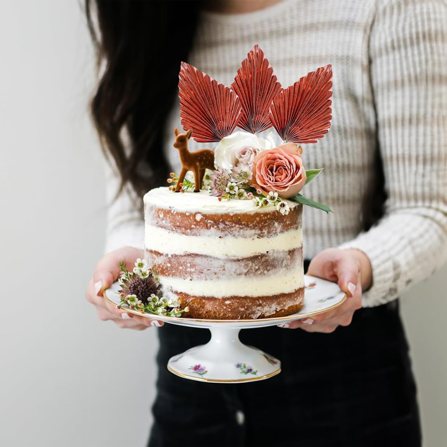 Ephlyn 6Pcs Paper Palm Leaves Fan Cake Toppers Palm Leaf Fan Cake Picks Craft DIY Fan Palm Spear Leaves Cake Decorations for Wedding Birthday Party Supplies Bright Rose Gold