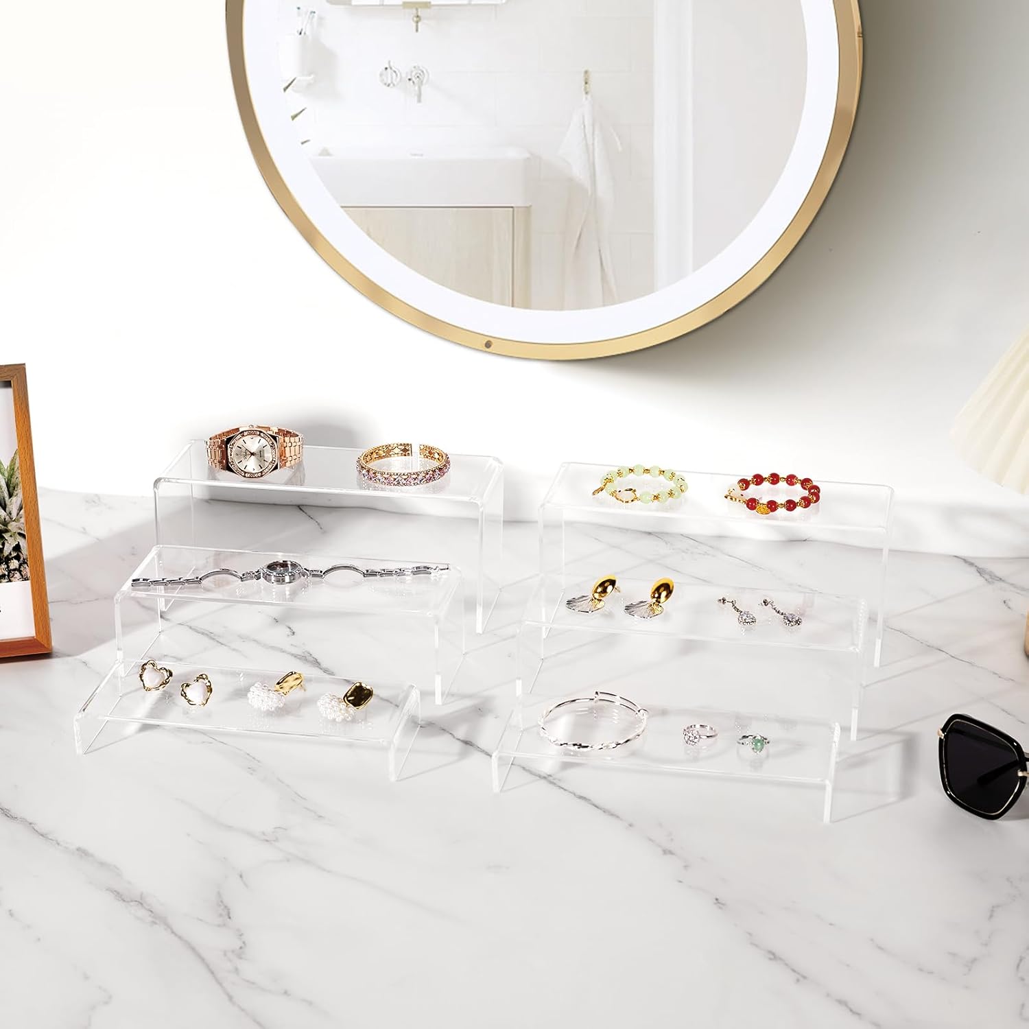 - VERSATILE USES: The clear display risers can meet your different needs for displaying and organizing various items such as desserts, jewelry, shoes, cosmetics, perfume,potted plants,collectibles, and more and suitable for living room, bedroom dresser, kitchen, display cabinet. Besides home use, our acrylic display stand can be used in other places, especially for birthday parties, weddings, art exhibitions, buffets and stores.