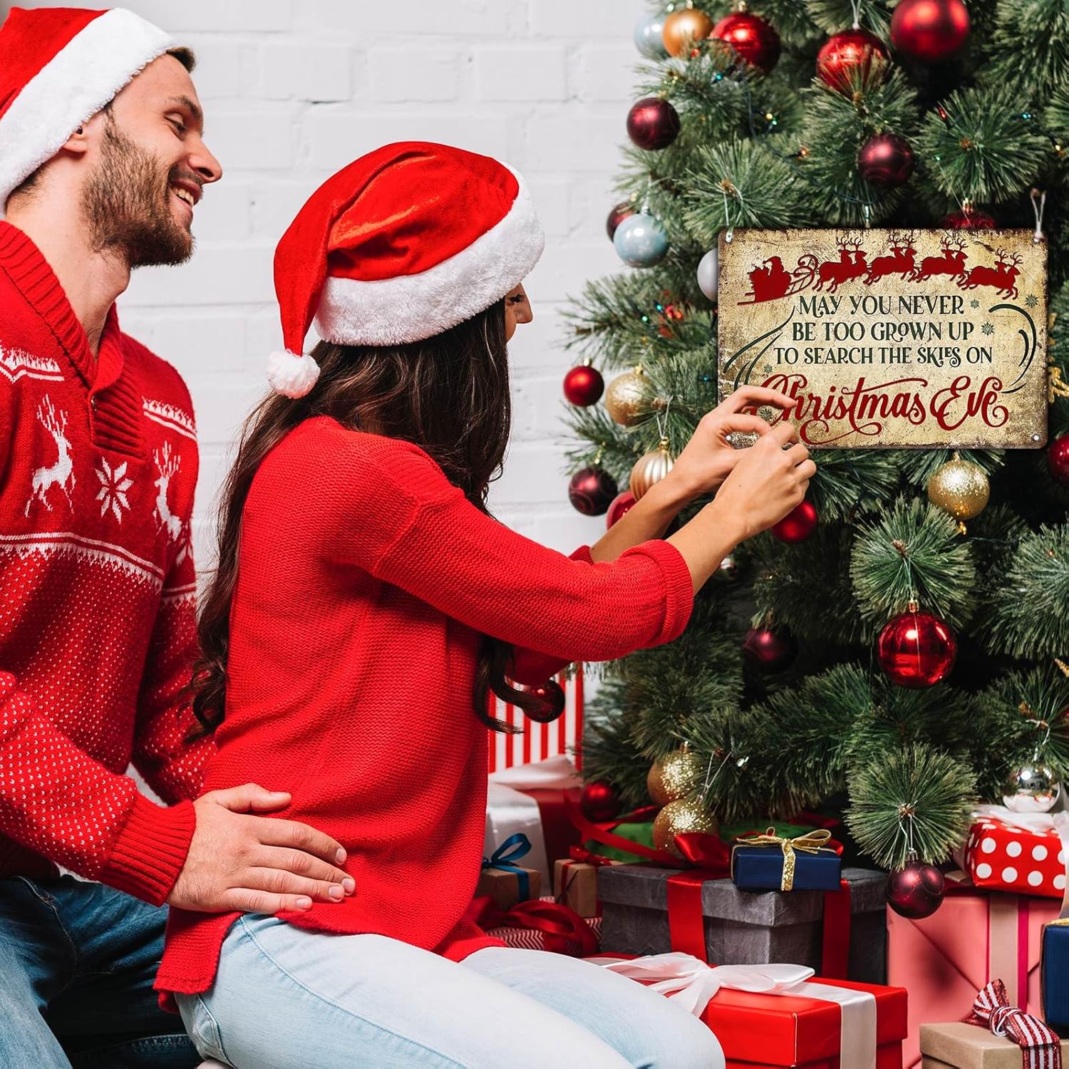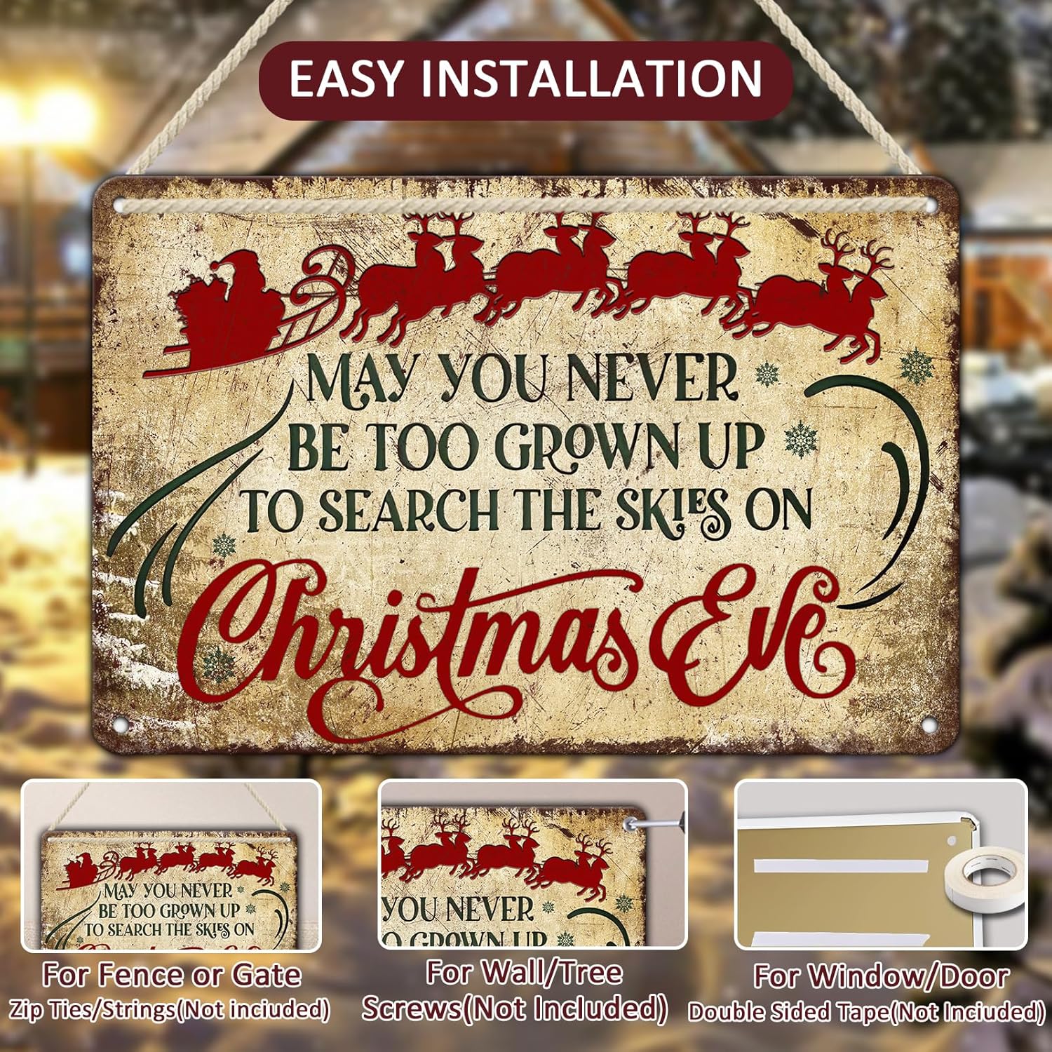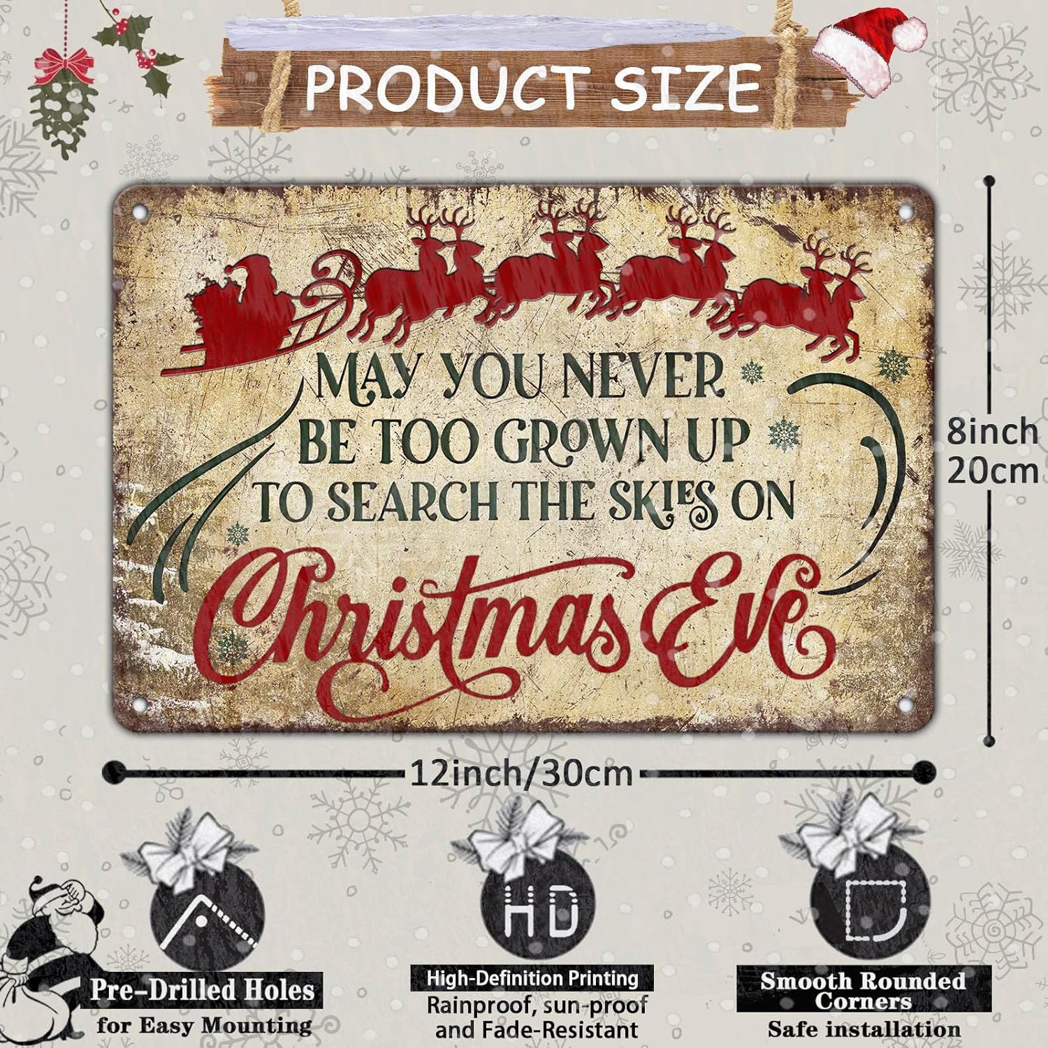 - Vintage Christmas Charm for Festive Home Decor Bring the magic of a classic Christmas to your home with our vintage sleigh design tin sign. Featuring the nostalgic quote "May You Never Be Too Grown Up to Search The Skies on Christmas Eve," this piece adds a touch of rustic wonder and heartfelt nostalgia to your farmhouse Christmas decor, creating a cozy holiday atmosphere that turns your living room into a festive sanctuary.