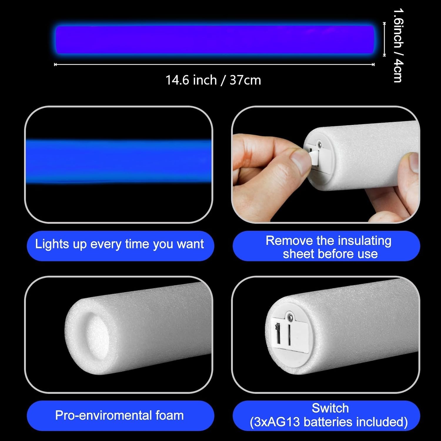 - Glow In the Dark Giant Foam Sticks: You will get 24 pack blue light up foam glow sticks. Press the power button to switch between the 3 different light up modes: quick flashing, slow flashing and alternately flashing. These LED foam sticks boast vibrant colors, offering wider light coverage and ensuring the excitement party experience,bring tons of joy for you and your families. Perfect for theme music festivals, birthday, camping, clubs, shows, goodie bag or stocking stuffer and more