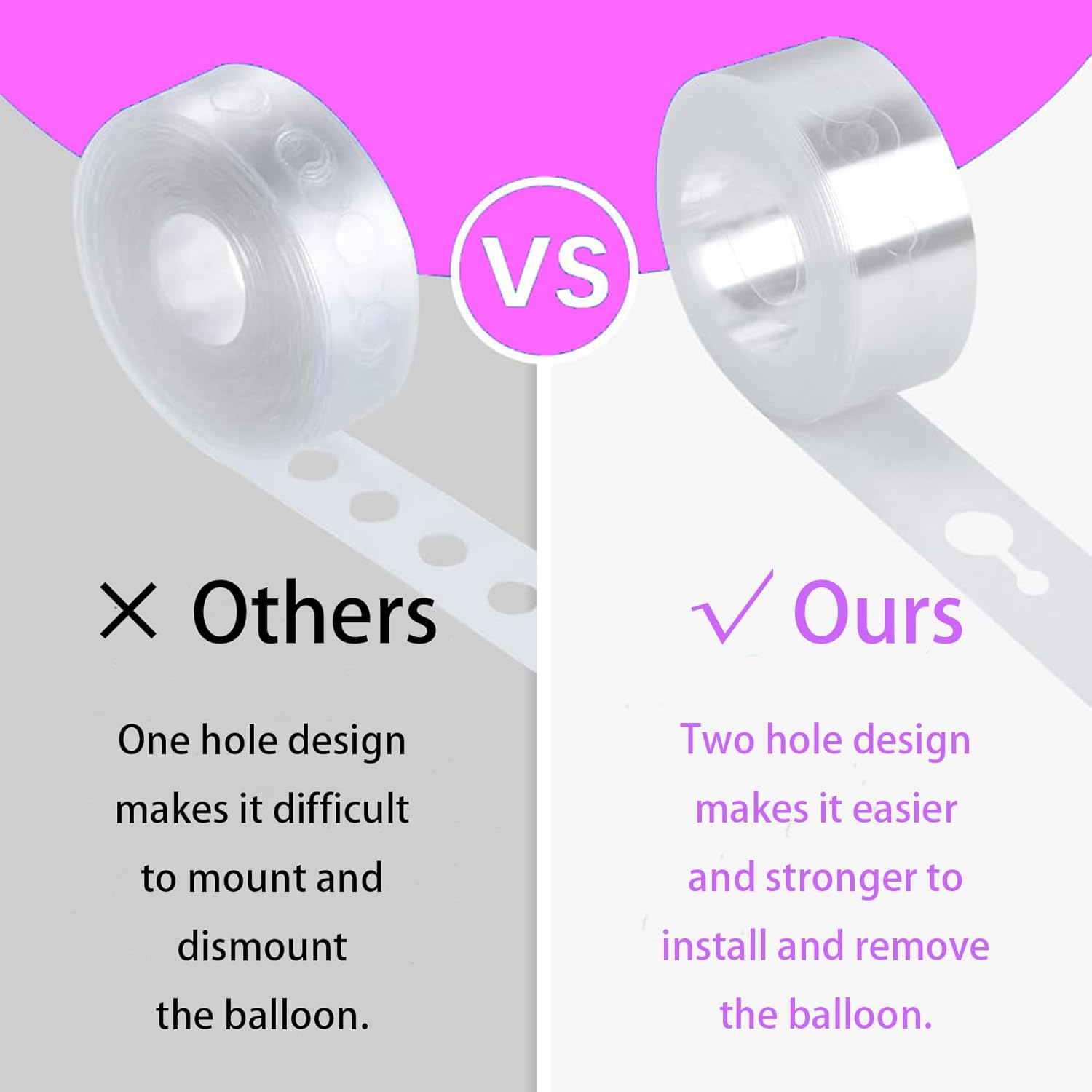 - Balloon Tape Strip,Easy to Assemble ,The unique two-hole design makes it easier to fix balloons. Pull the balloon knots into the large hole and then move to the small spot to make the balloons more fixed. Super easy and breezy putting balloon columns together.