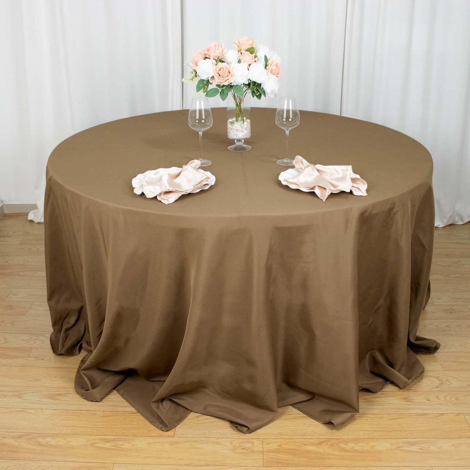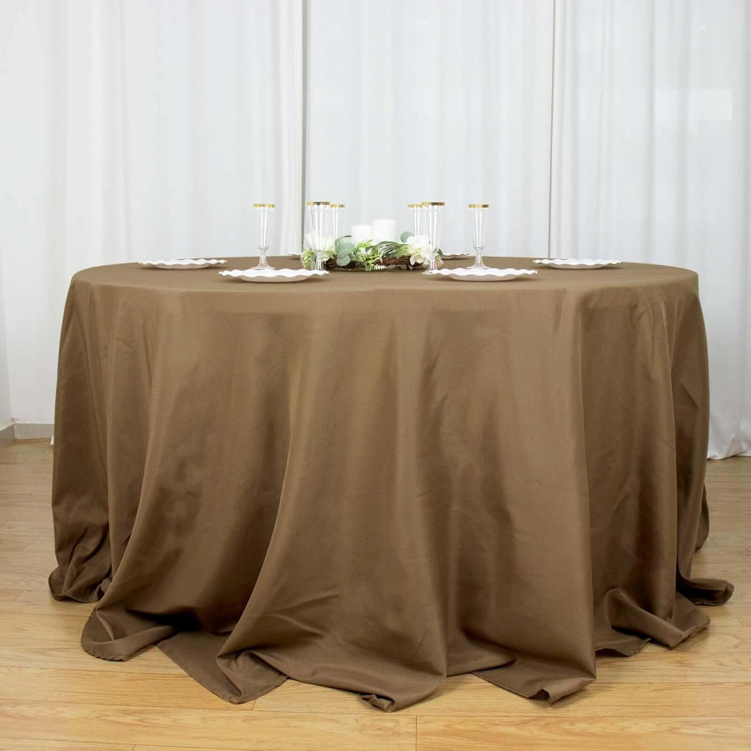 - Quantity: 1 Round Tablecloth Material: 100% Polyester Color: Taupe Size: 132" Dia. 1 pc, seamless design Stain & Wrinkle Resistant, Machine Washable Hemmed edges for an exquisite look. Gives floor length hang on standard 6ft (72") tables