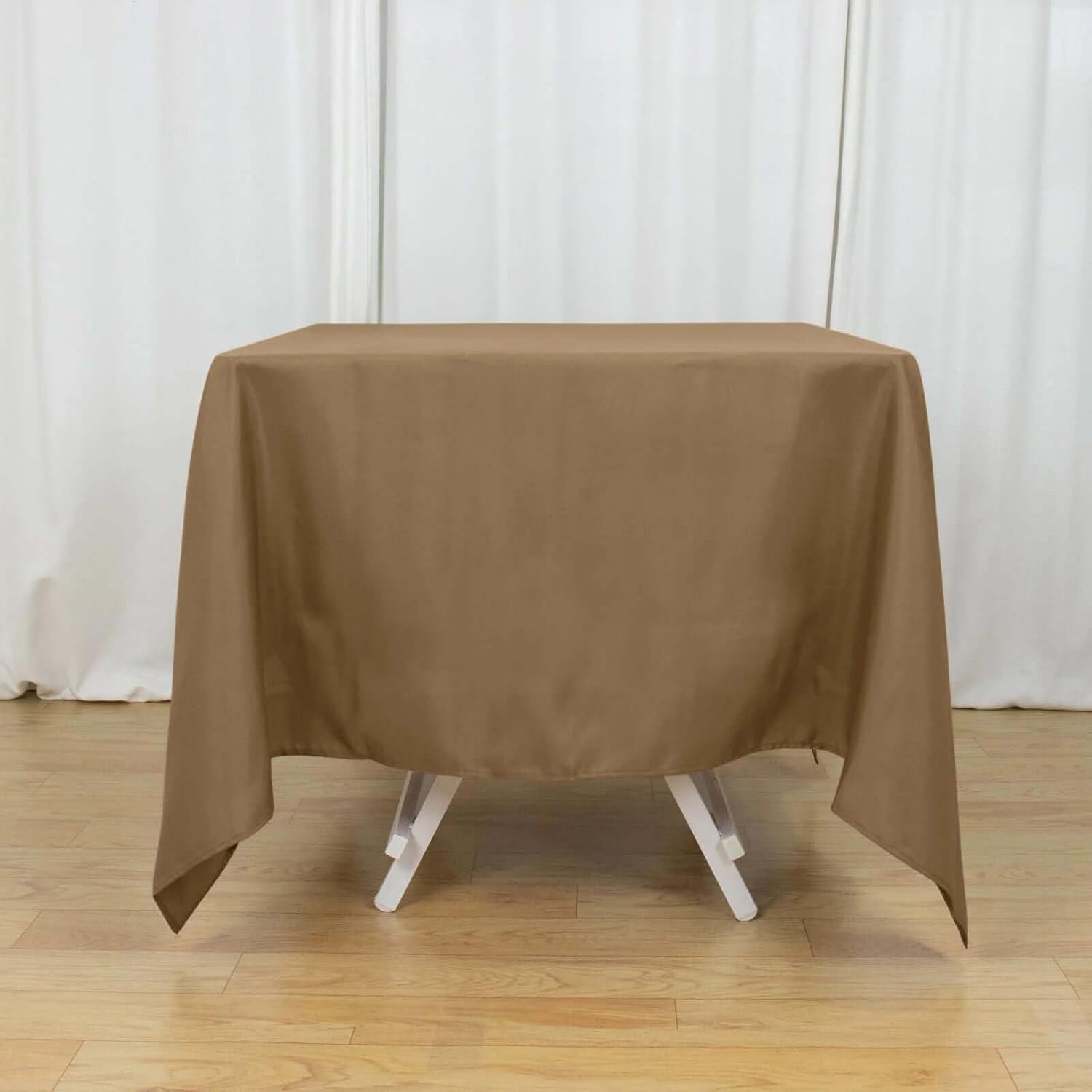 - Quantity: 1 Square Tablecloth Material: 100% Polyester Color: Taupe Size: 70" x 70" Thickness: 130 GSM Stain & wrinkle resistant, machine washable 1 piece, seamless design Hemmed edges for an exquisite look.