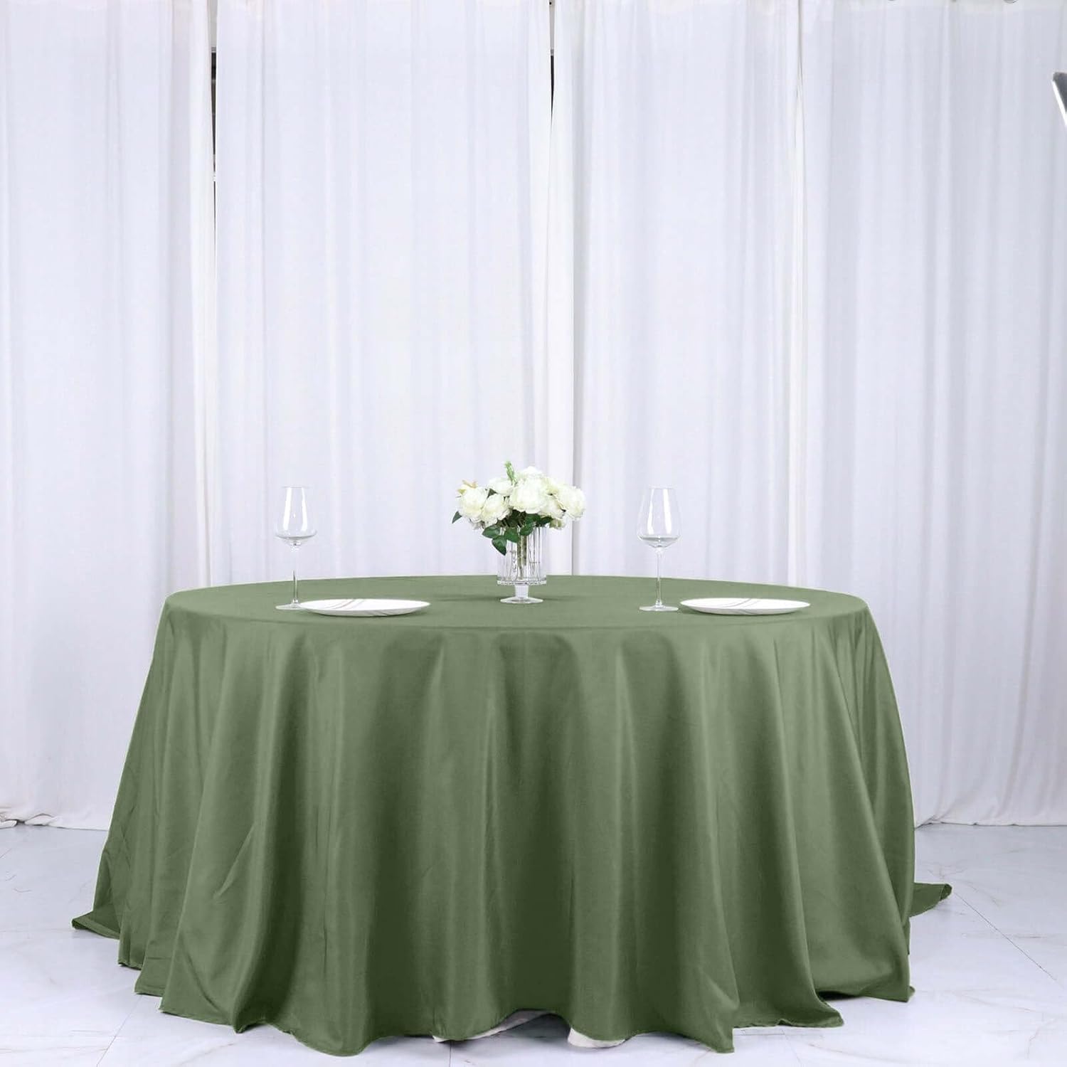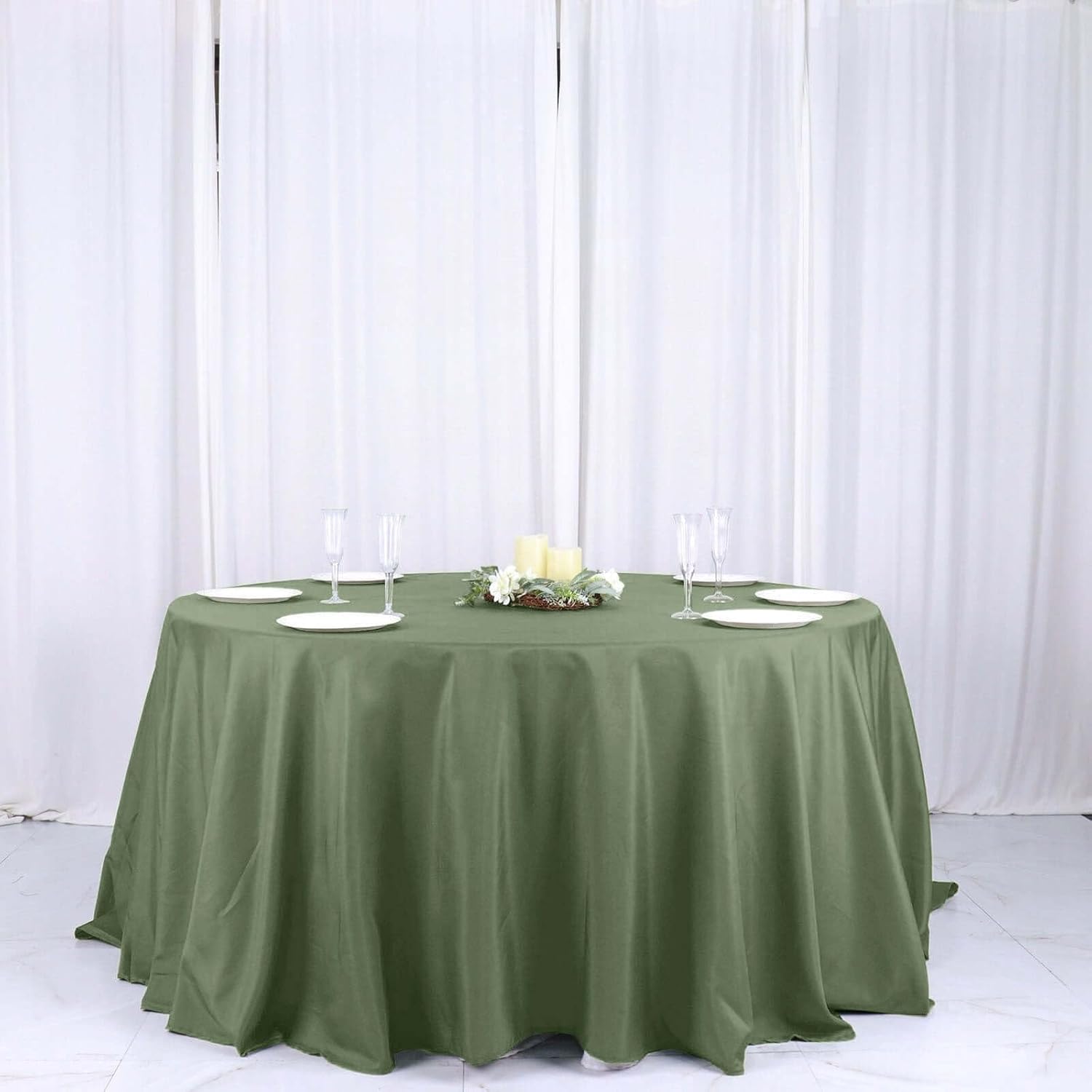 - Quantity: 1 Tablecloth Material: 100% Polyester Color: Olive green Size: 132" Dia. 1 pc, seamless design Stain & Wrinkle Resistant, Machine Washable Hemmed edges for an exquisite look. Gives floor length hang on standard 6 ft (72") tables