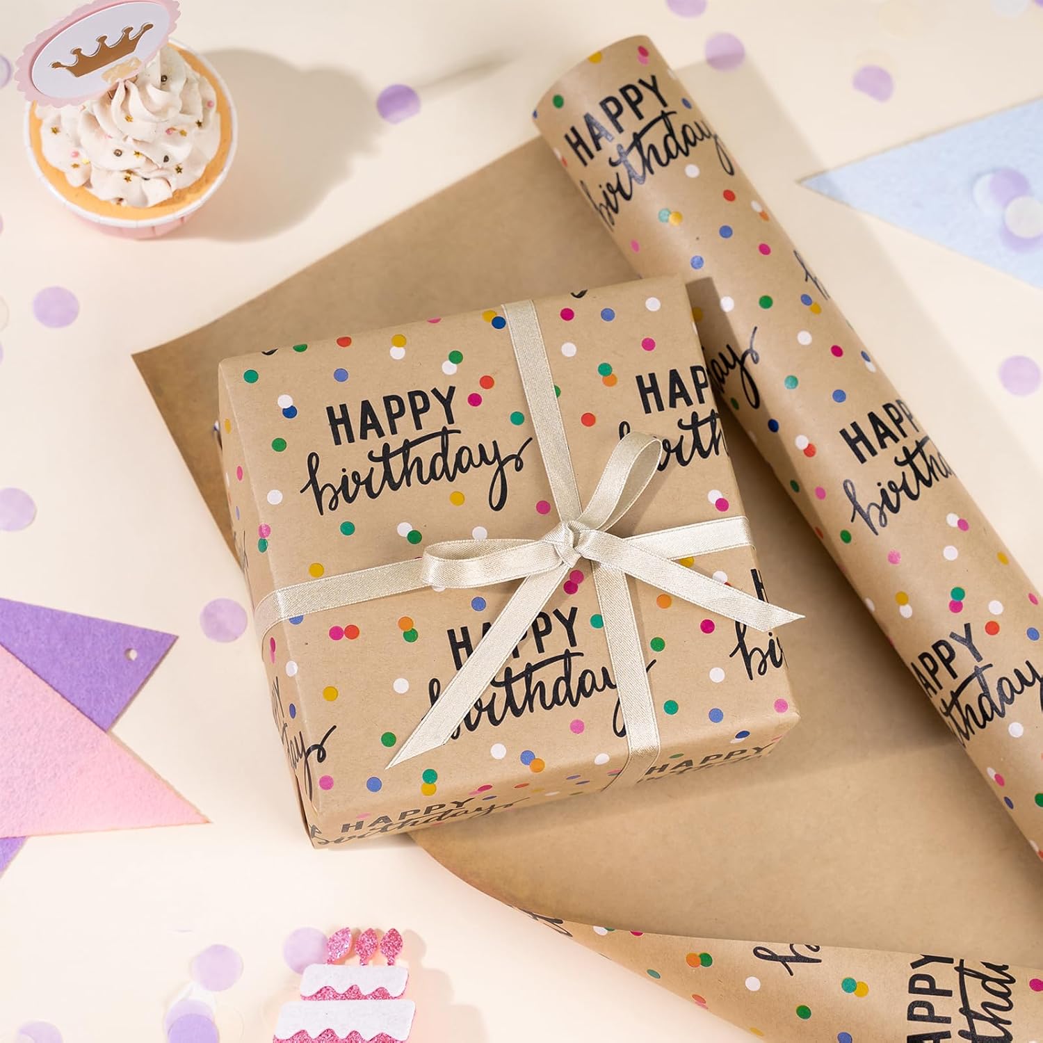 - Birthday Wrapping Paper: This beautifully designed birthday wrapping paper roll features a charming "Happy Birthday" message, complemented by a playful pattern of colored polka dots in warm brown tones. The elegant design adds a refined and sophisticated touch to any birthday celebration, making it perfect for all occasions—from casual parties to formal gatherings.