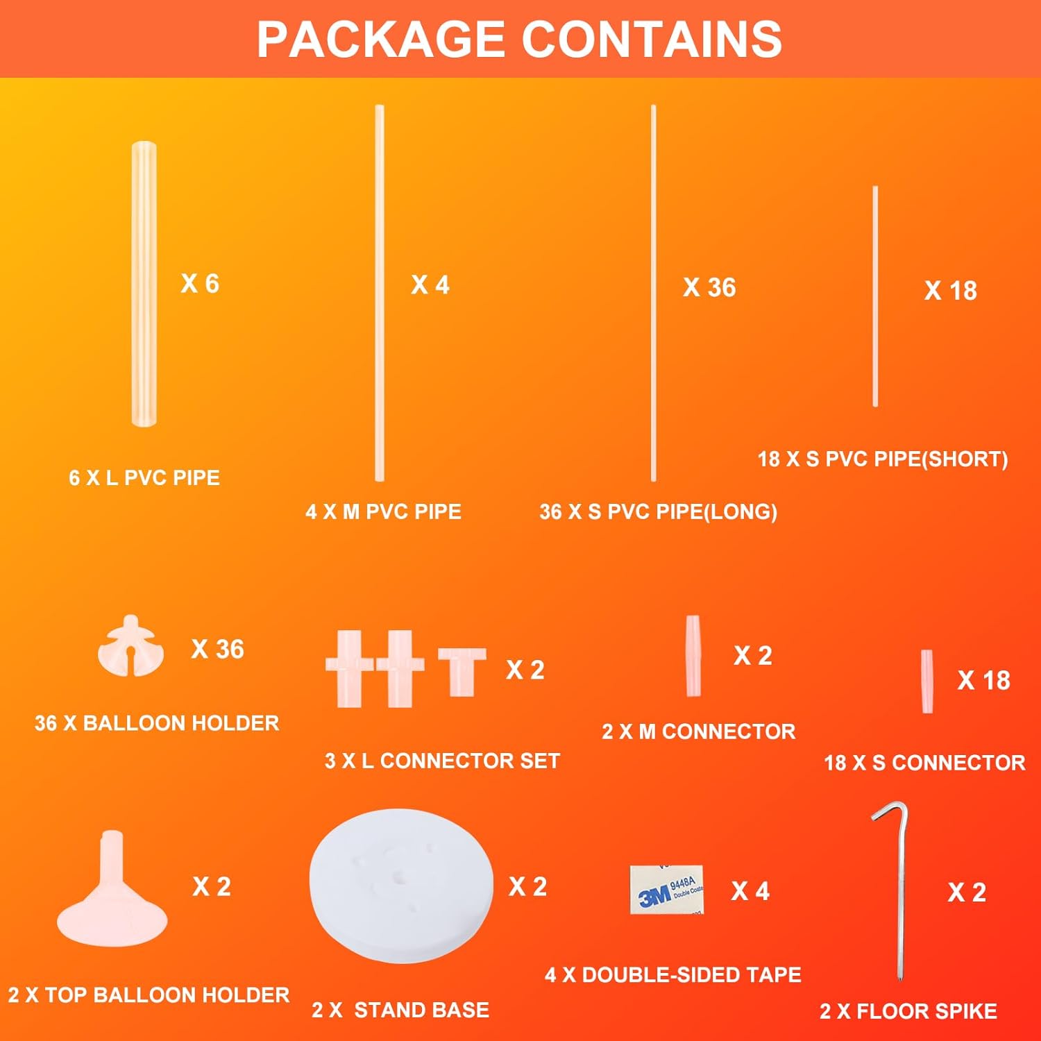 - [Package Included] - Complete Set for Your Convenience: Our KATBUU balloon arch kit includes 2 sets of balloon stands(Not include Balloons), featuring 64 unattached balloon sticks, 38 balloon holders, 6 seven-hole connectors, 20 connectors, 2 water-filled base, 2 floor nail, 4 double-sided tape, and 1 set of user instructions. No need for a rental helium tank - create stunning balloon displays right at home. This is sure to make your PARTY special.
