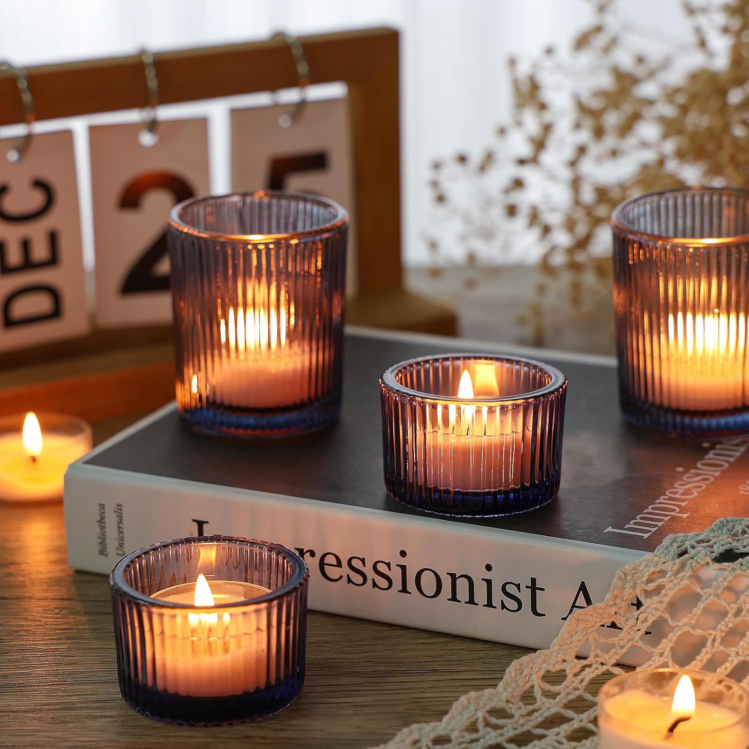 24 Pcs Ribbed Votive Candle Holders, Dark Blue Glass Holders Bulk for Table Centerpiece, Tealight Holders Glass for Wedding Shower, Party and Home Decor