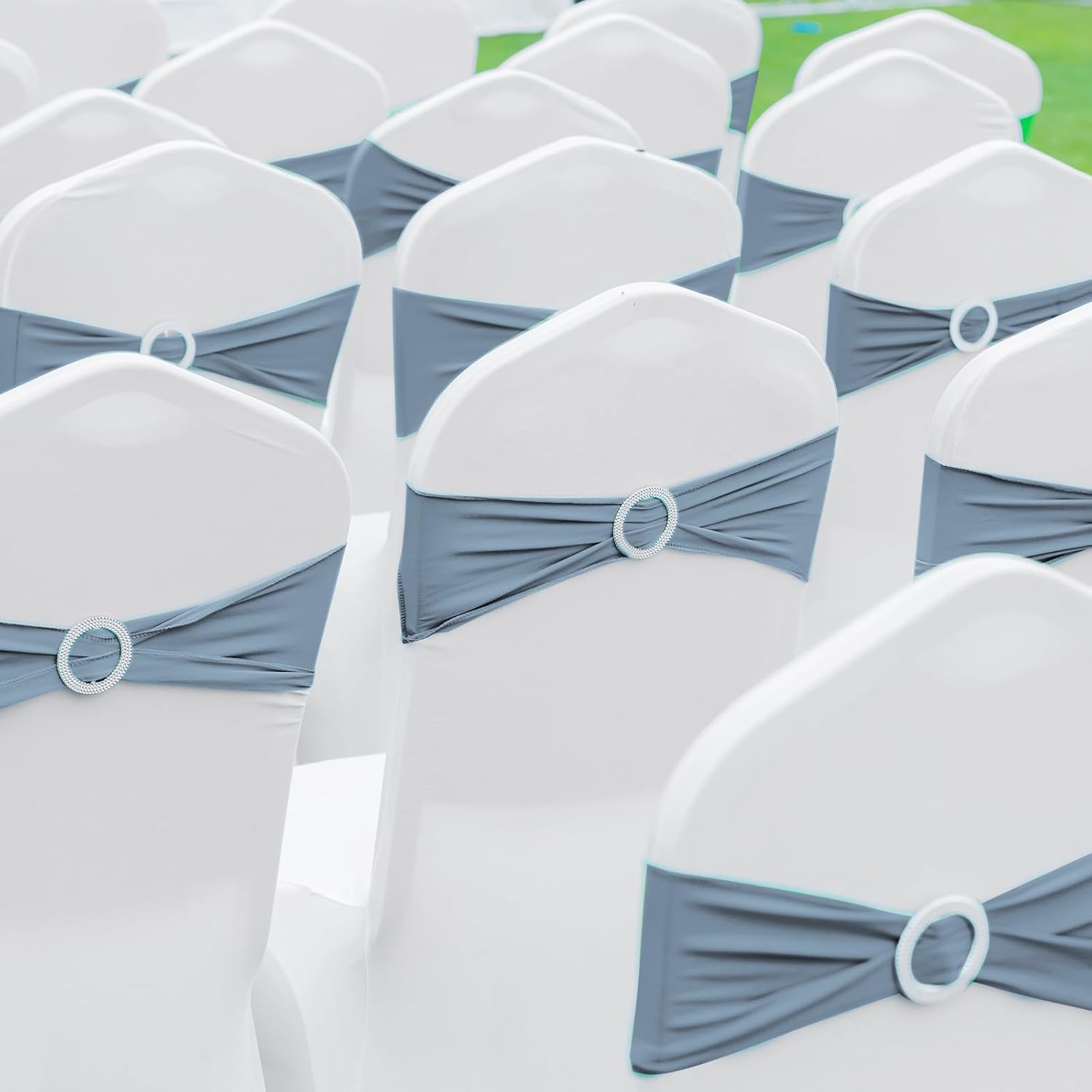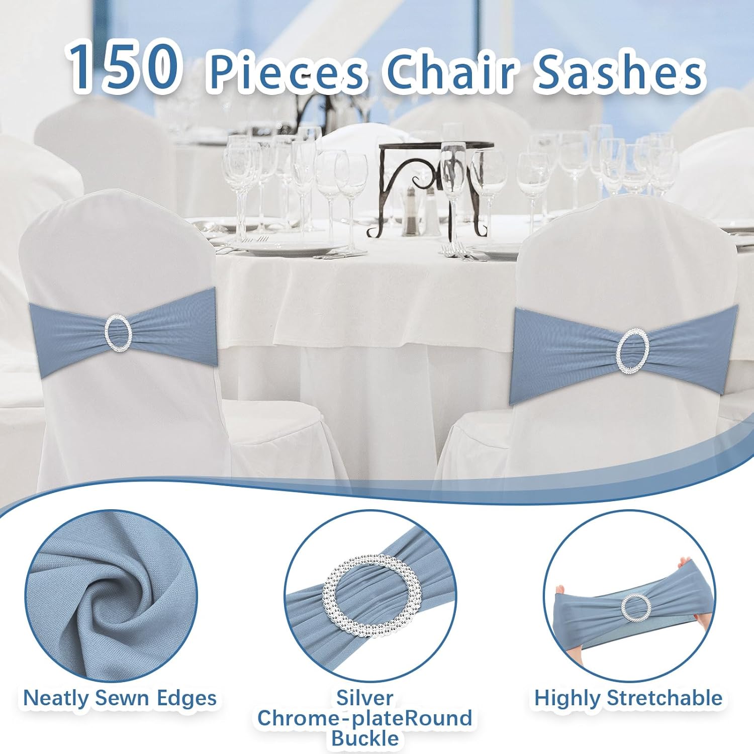 CHENGU 150 Pieces Spandex Stretch Chair Sashes Bows Elastic Chair Cover Bands Ties with Buckle Slider for Wedding Party Reception Events Universal Ceremony Banquet Decorations(Dusty Blue)