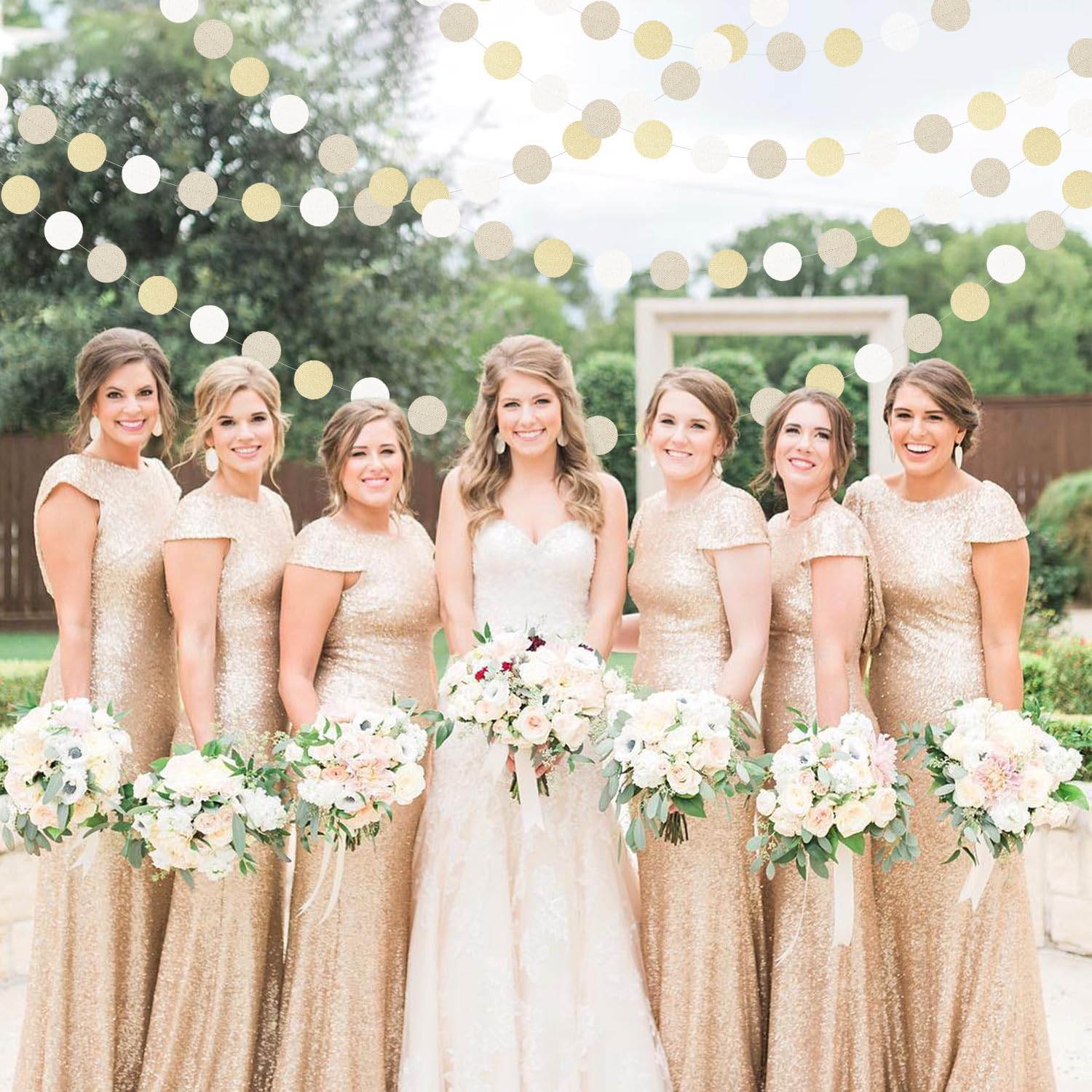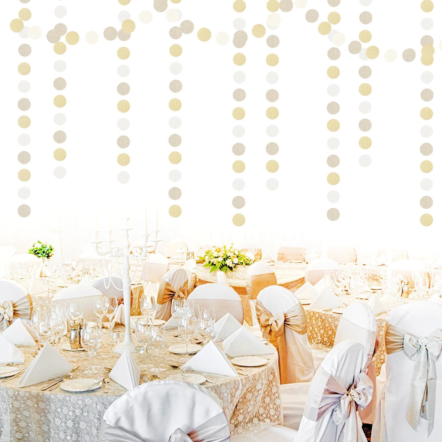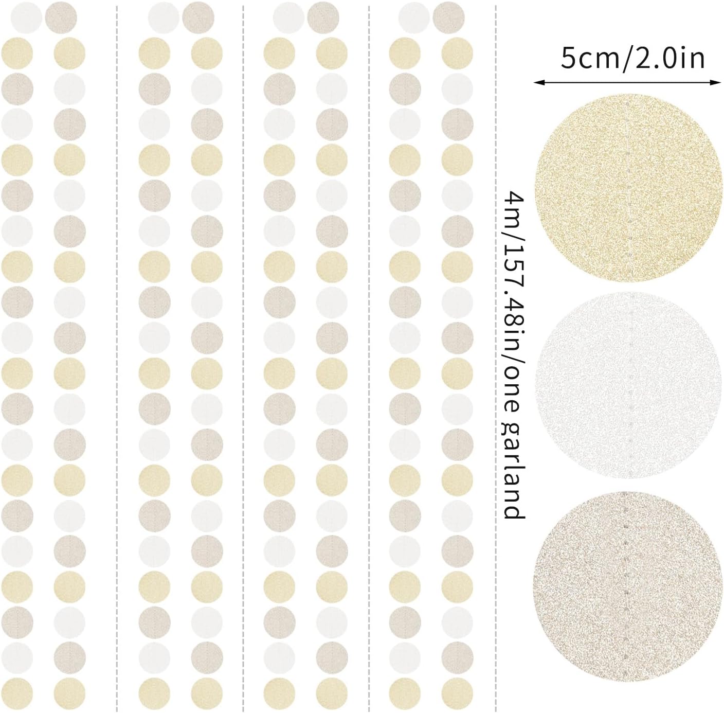 - PACKAGE CONTAINS: This set has four champagne gold white circle paper garland,the length of each strand is 4 meters/13 feet, the total length is 16 meters/52 feet.The size is 2IN.