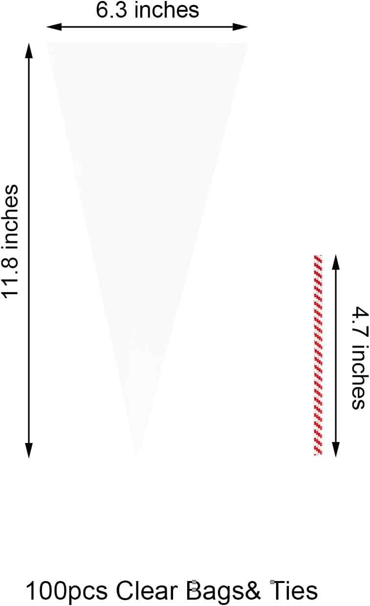 - 【Crystal Clear & Food-Grade Transparency】: Made from premium, extra-thick, food-grade OPP material, our cone bags offer a crystal-clear appearance that beautifully showcases candies, popcorn, handmade gifts, and more. The crisp material enhances the look of your packaging, making it ideal for parties, weddings, and holiday gift wrapping, ensuring your treats stand out.