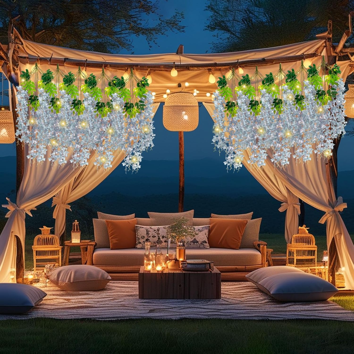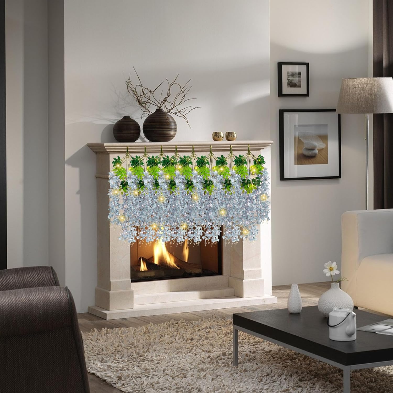 - 【Package Included】12 pieces of silk grey wisteria hanging flowers, each length 41.27 inches. Every artificial wisteria garland has 3 branches and 6 leaves, the wisteria flower petal length is 21.62 inches. It also comes with a warm light string that requires 2 AA batteries (Note: There may be some color differences in different lights, product not include batteries)
