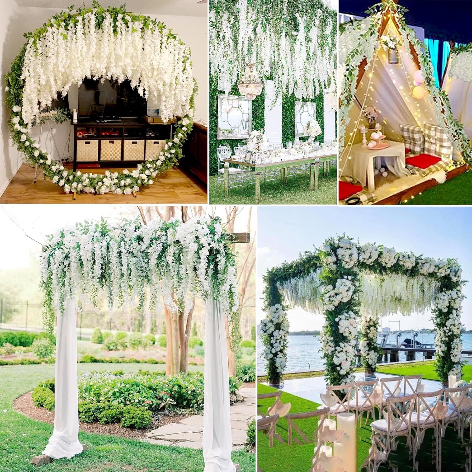 - 【Package Included】12 pieces of silk white wisteria hanging flowers, each length 41.27 inches. Every artificial wisteria garland has 3 branches and 6 leaves, the wisteria flower petal length is 21.62 inches. It also comes with a warm light string that requires 2 AA batteries (Note: There may be some color differences in different lights, product not include batteries)