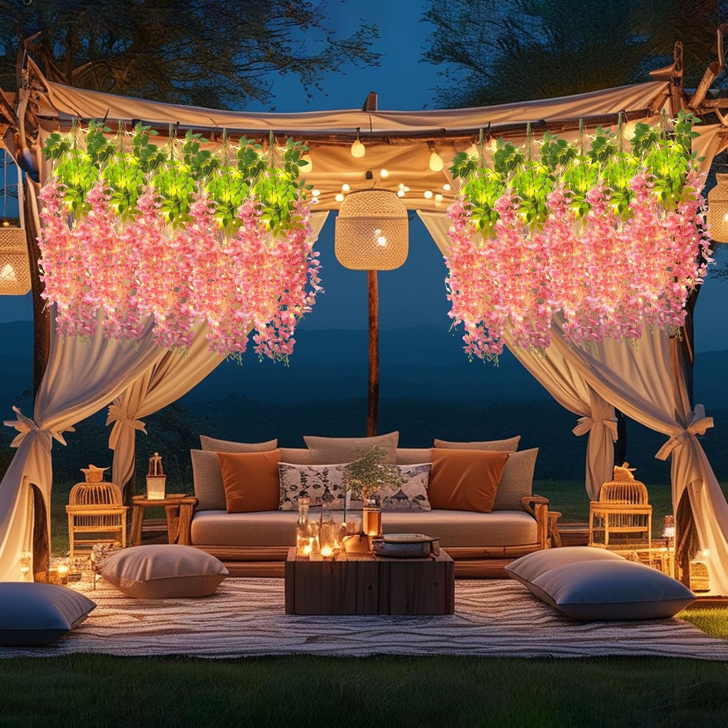 - 【Package Included】12 pieces of silk dark pink wisteria hanging flowers, each length 41.27 inches. Every artificial wisteria garland has 3 branches and 6 leaves, the wisteria flower petal length is 21.62 inches. It also comes with a warm light string that requires 2 AA batteries (Note: There may be some color differences in different lights, product not include batteries)