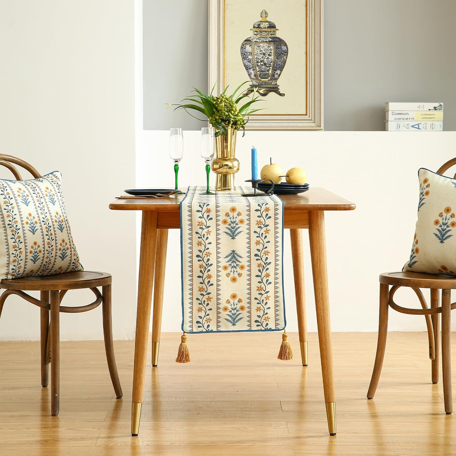 - Unique Design:Each table runner features patterns hand-drawn by our designers,showcasing exquisite details and rich textures for stunning visual appeal.The meticulous stitching ensures a smooth,wrinkle-resistant,and durable finish.With its fresh,rustic yet elegant style,it adds vibrancy and charm to your home decor