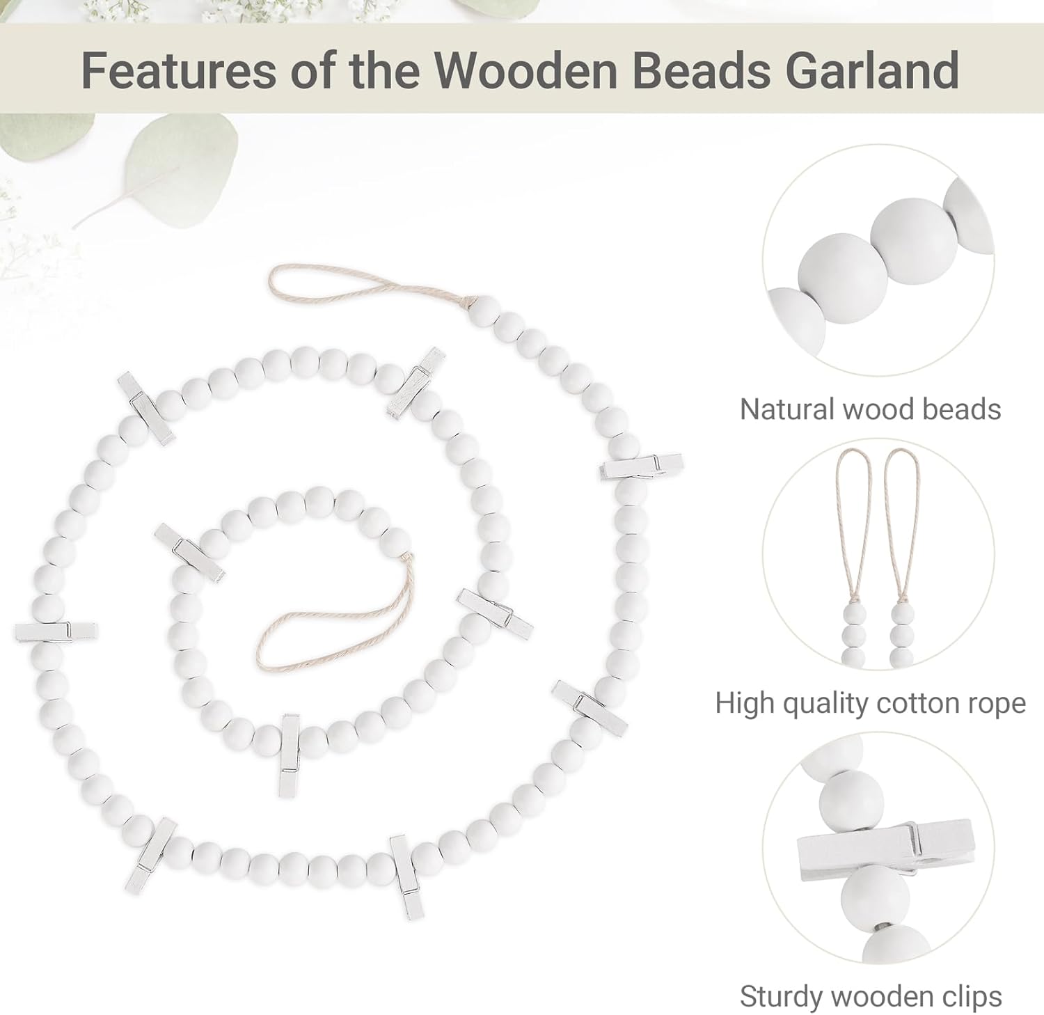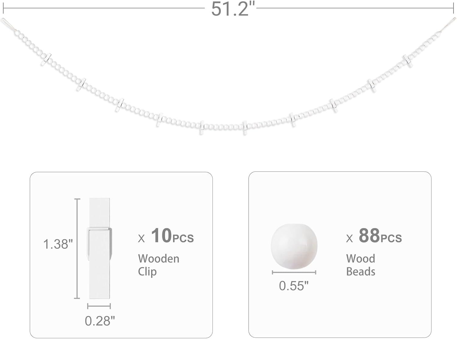- Size and Package: The total length of the whole garland is 51.2 inches, with a wood bead chain length of 46 inches. Each garland includes 10 clips, with 8 wooden beads spaced between each wooden clip. This set includes 2 pieces, catering to your various needs for picture display and home decor. Note: This is a handmade item, the length of the garland may has 1-2 inches deviation.