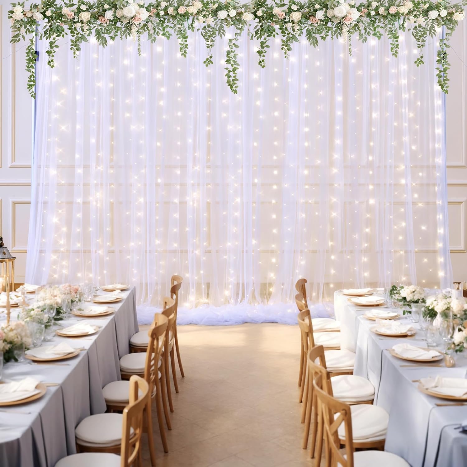 10x10ft White Tulle Backdrop Curtain with Lights String for Parties Wedding Twinkle Sheer Backdrop Curtains for Bridal Shower Birthday Party Baby Shower Photo Booth Decorations