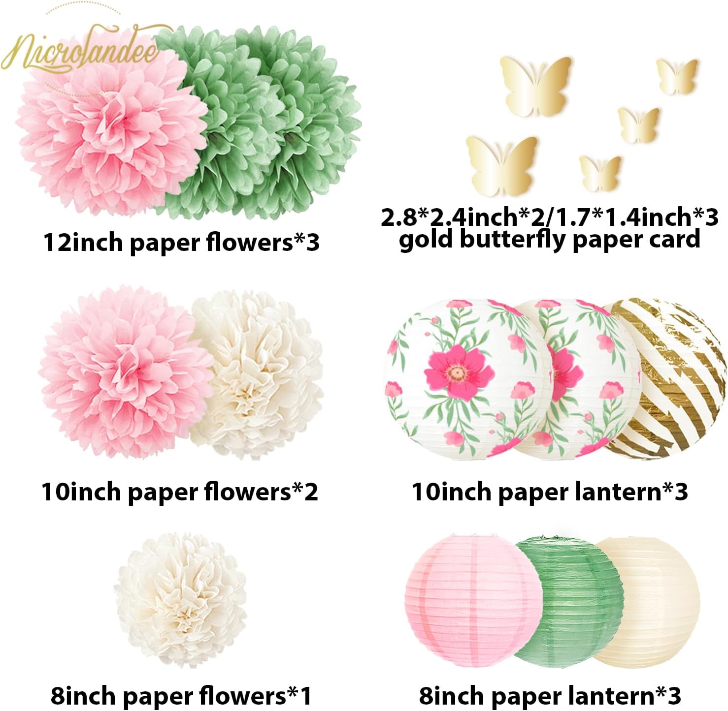 - Included Components : 6 pieces tissue pom poms, 6 pieces paper lanterns, 5 pieces gold foil butterflies