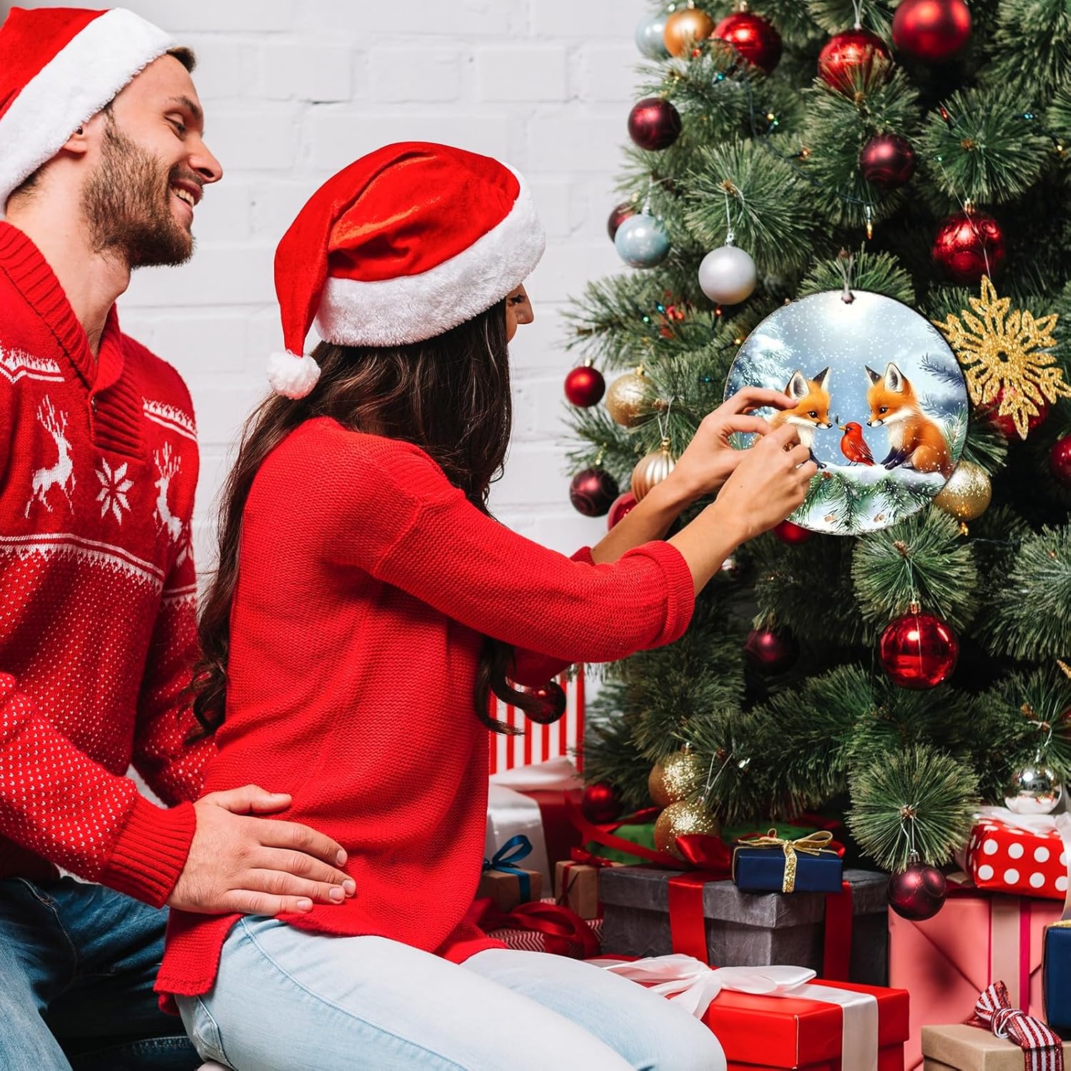 Christmas Round Fox Metal Tin Sign - Red Bird Winter Vintage Sign for Home & Outdoor Decorations - 8 * 8 in