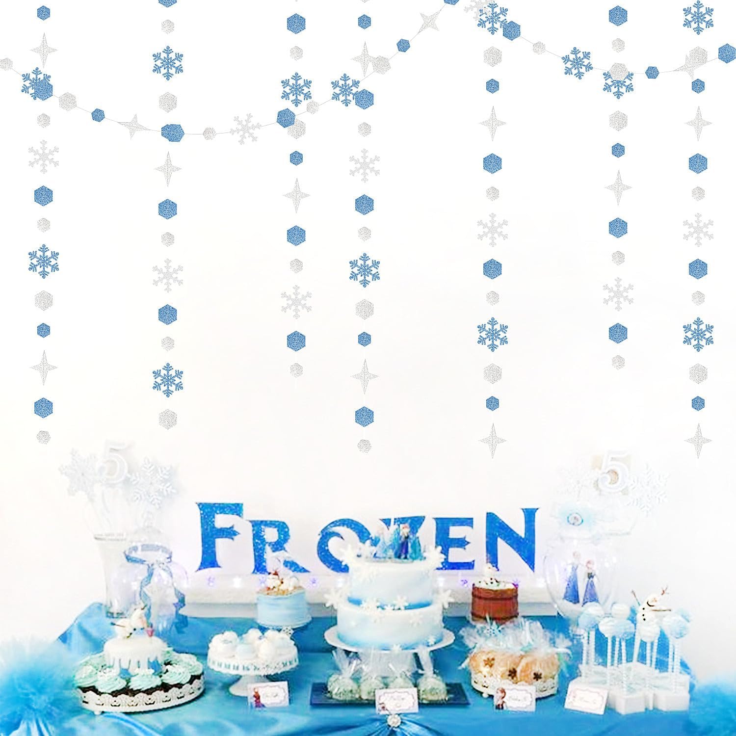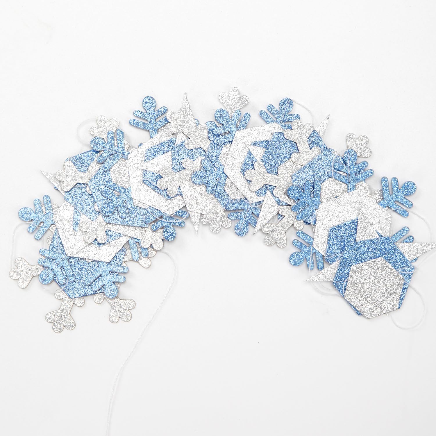 - PACKAGE CONTAINS: This set has four silver blue snowflake paper garland,the length of each strand is 4 meters/13 feet, the total length is 16 meters/52 feet.The snowflake size 2.8IN,quadrangle size2.8IN,hexagon size1.6IN and 1.2IN.