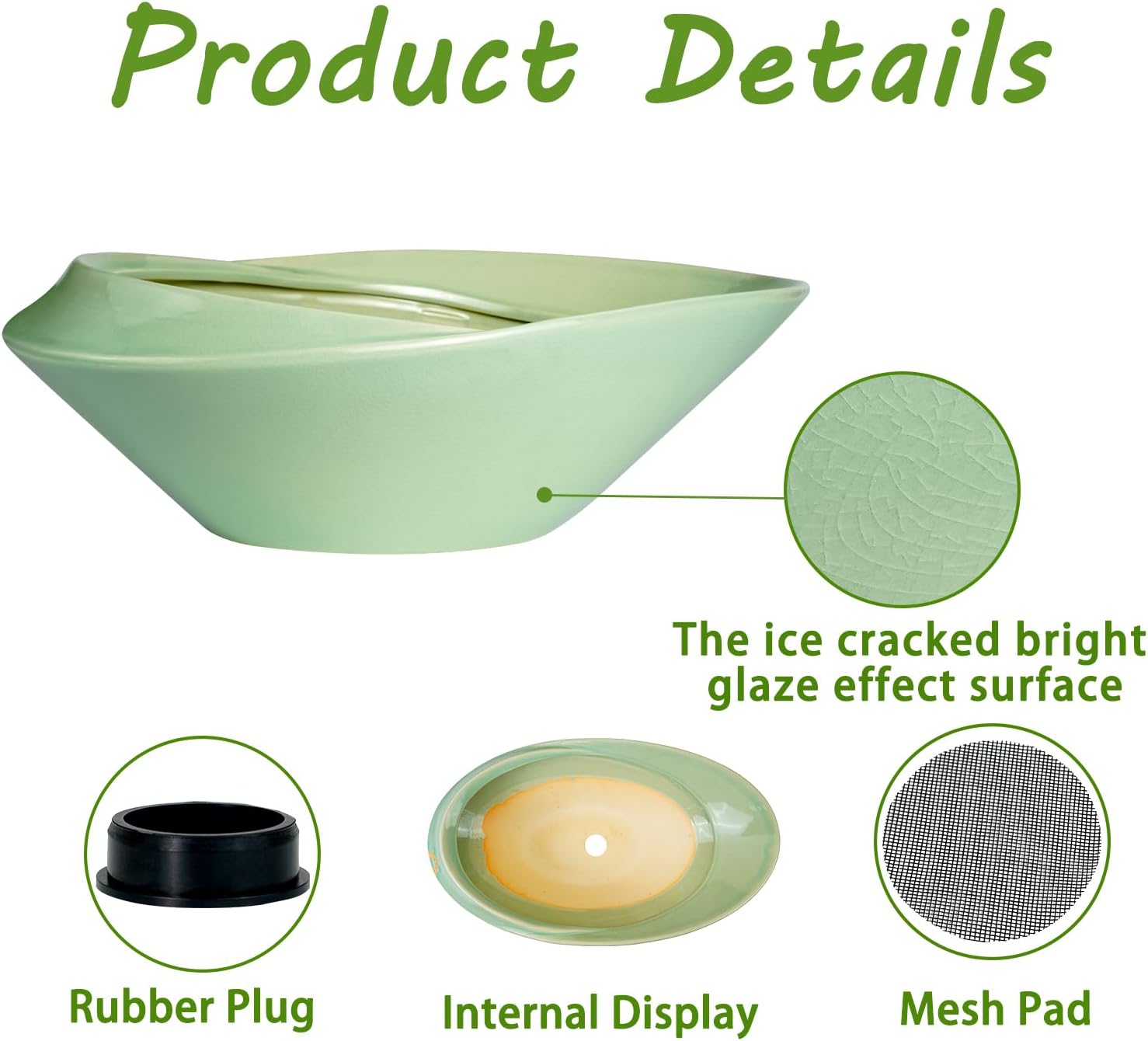 - Dimensions of This Green Plant Pot: The large ceramic planter is 18*10.23*5.5 inch, and the mesh pad is 2.36*2.36 inch. Plants not included