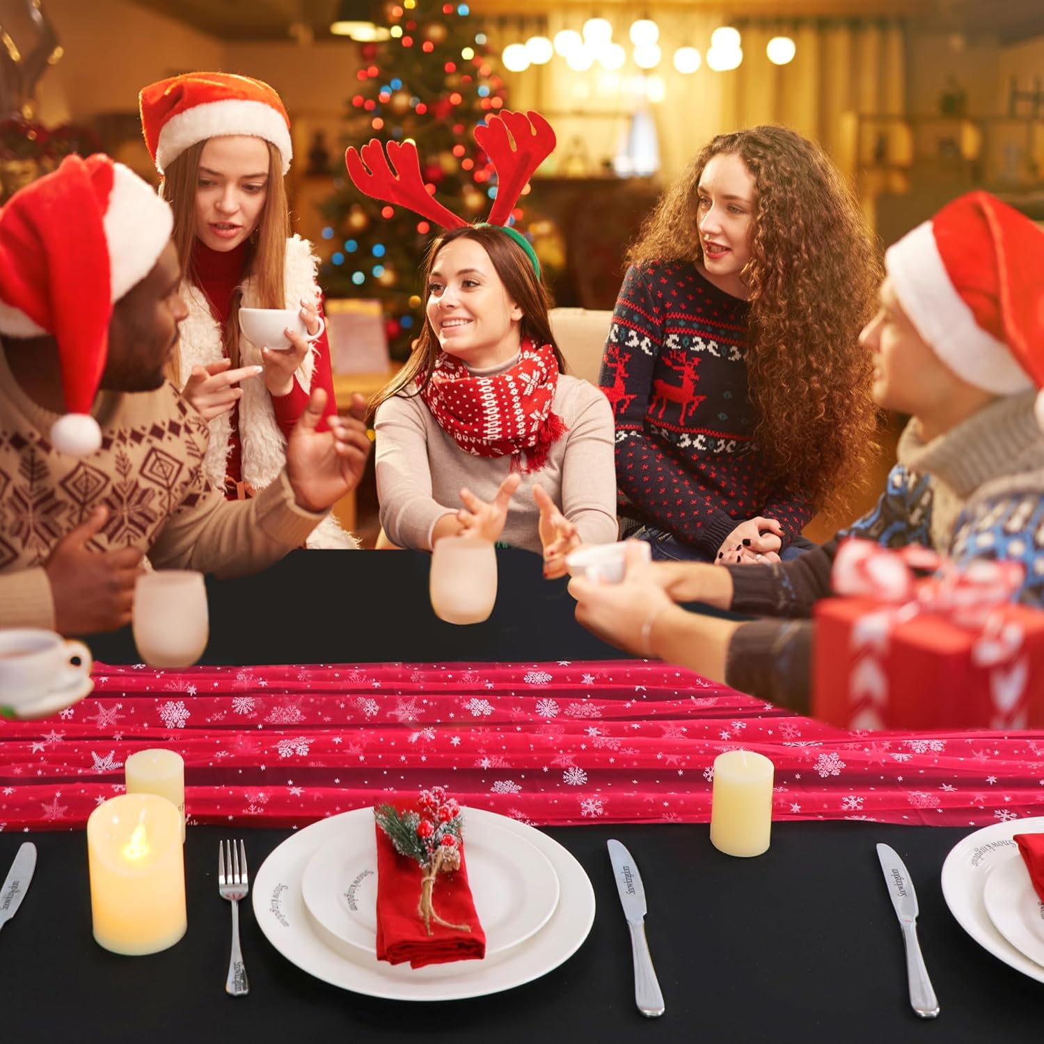 - Elegant Design: Delicate white snowflakes adorned on classic red gauzy fabric, similar with cheesecloth runner with a lightweight and flowing quality. It drapes elegant over table edges create an softness, graceful and romantic ambiance