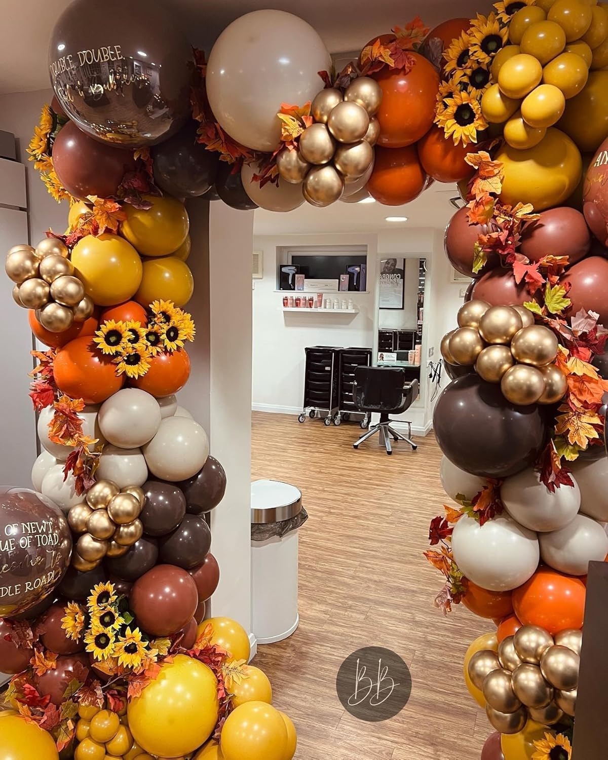 - ăWHAT YOU WILL GETăOur birthday party balloons include 50pcs brown and gold balloons, designed to help you create stunning decoration: 14 x retro brown balloons, 5 x metallic gold balloons, 8 x retro apricot balloons, 4 x confetti gold balloons, 14 x retro sand white balloons, 5 x retro coffee balloons, 1 x white ribbon, and 1 x gold ribbon. The size of the balloon is about 12 inches after inflation. The combination of brown and gold can make party or occasion more classy.