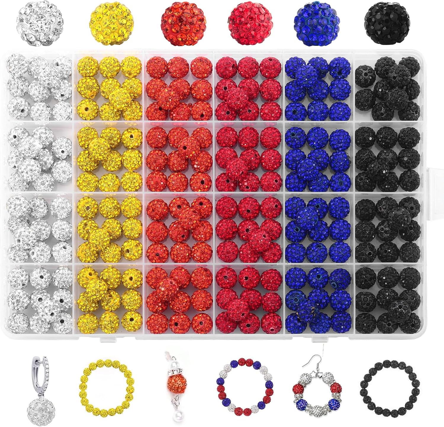 - PACKAGE INCLUDE: 240 rhinestone beads, about 10mm in diameter and 1.8mm in aperture, evenly distributed in a 24-grid plastic storage box. The overall color of the set is yellow series, with three basic colors of red, black, and white, and three gradient warm colors of red, orange, and champion yellow. 40 beads of each color can meet the needs for Crafting.