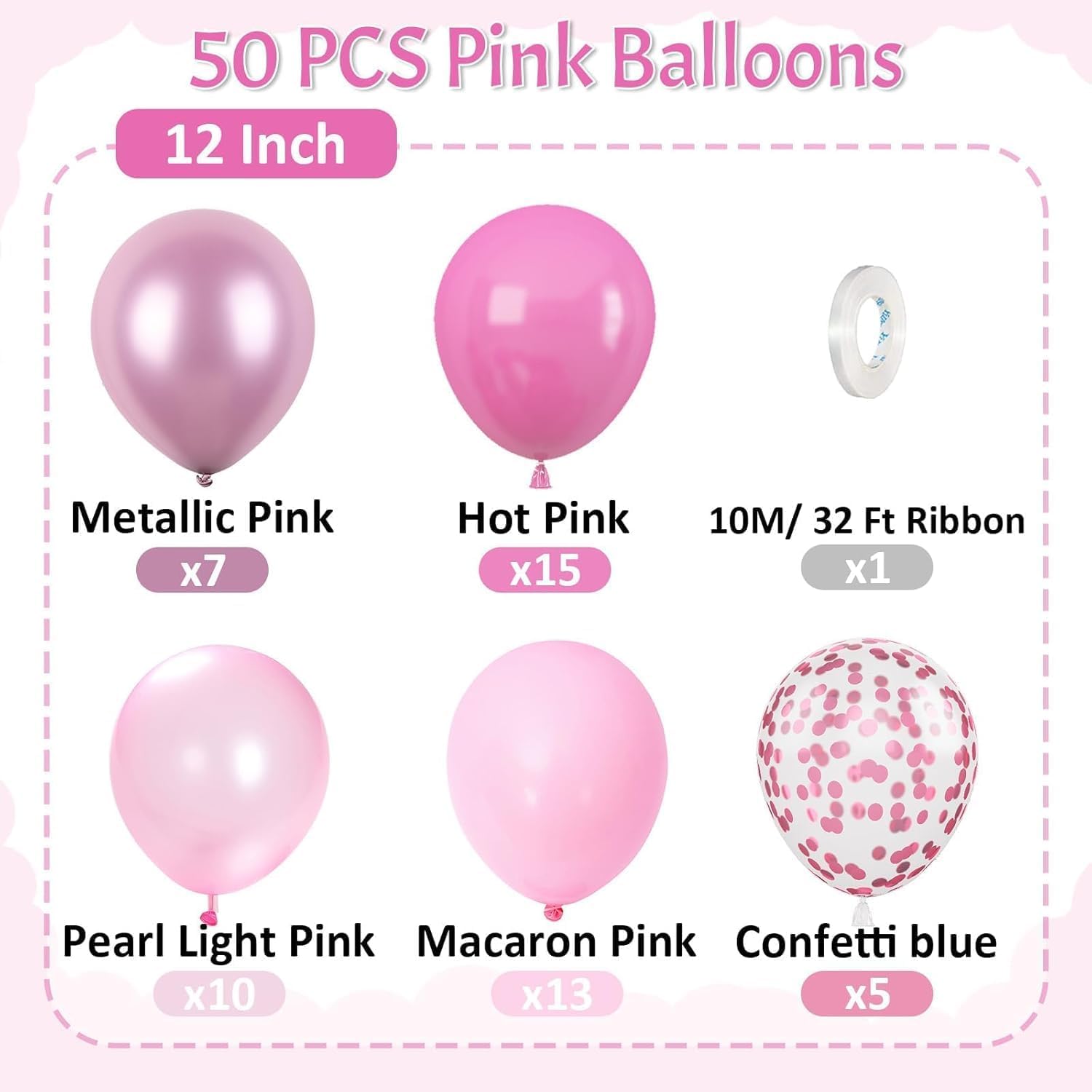- What You Get - The pink balloons include 50 balloons, 5 distinct colors: hot pink balloons x 15, metallic pink balloons x 7, macaron pink balloons x 15, pearl light pink balloons x 10, confetti pink balloons x 5. Accompanying by a 10m ribbon. These striking and captivating hues will beautifully enhance your memorable and enjoyable moments!