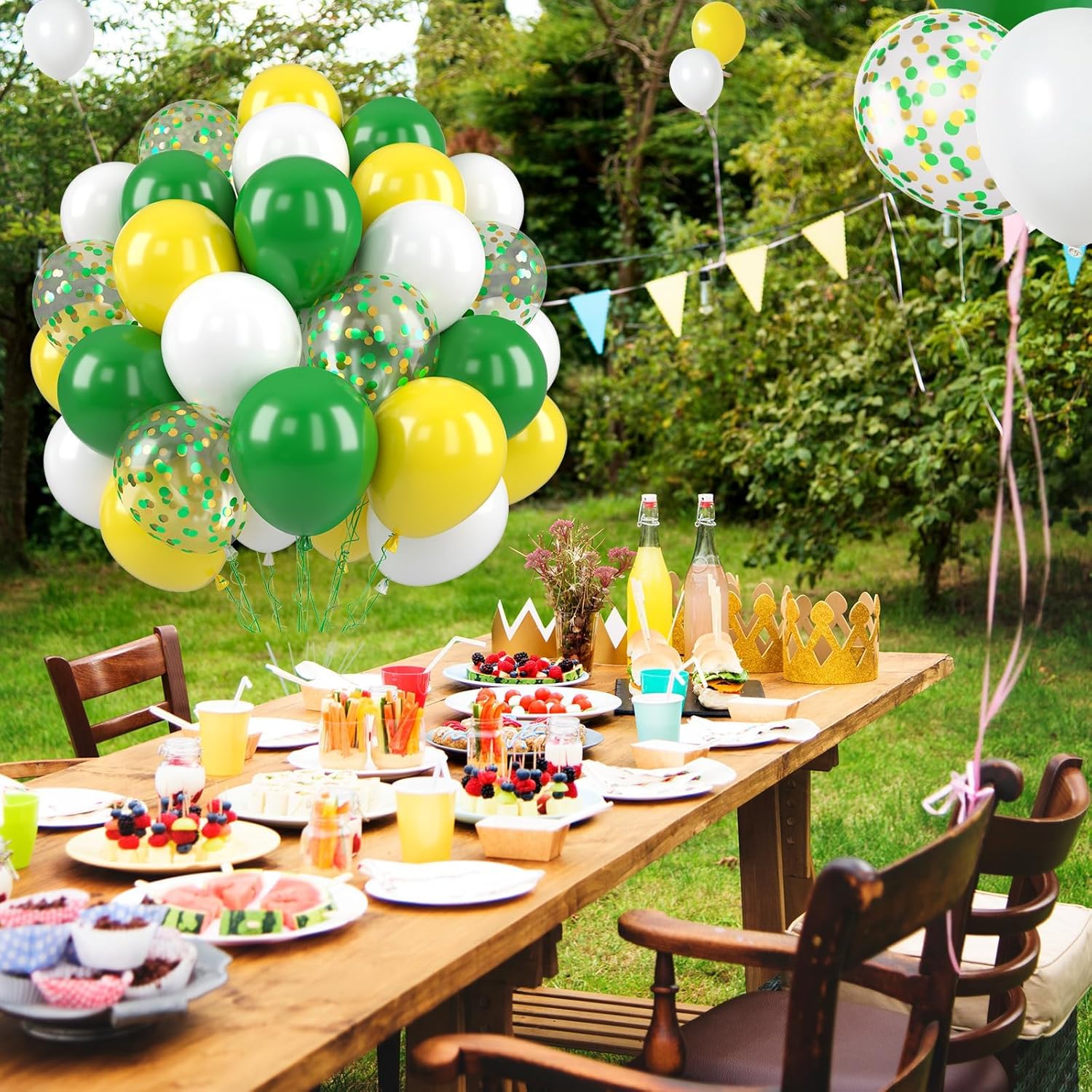 - What You Get - The green and yellow balloons include 50 balloons, 4 distinct colors: dark green balloons x 15, white balloons x 15, yellow balloons x 15, confetti green-gold balloons x 5. Accompanying by a 10m ribbon. These striking and captivating hues will beautifully enhance your memorable and enjoyable moments!