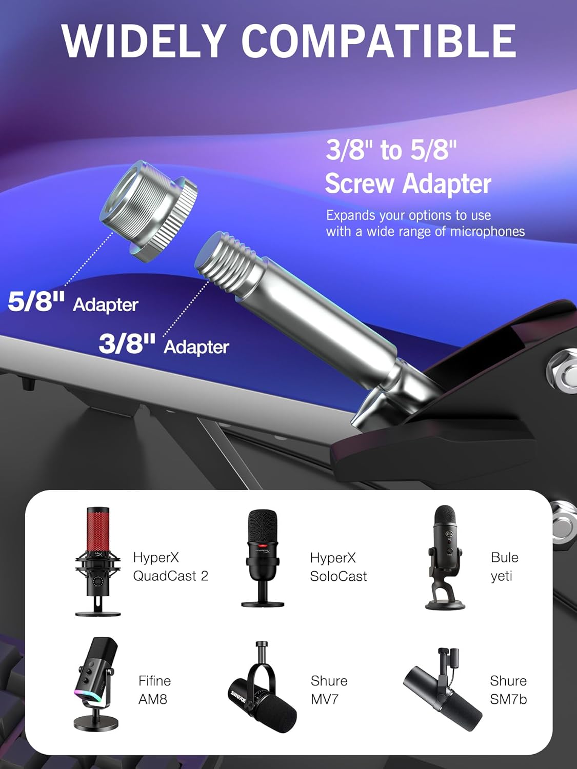 - Wide Adaptability - This microphone boom arm comes with 3/8" and 5/8" adaptors compatible with various models of microphones, For example: QuadCast, Blue Yeti, Snowball, solocast, Shure SM7B, Fifine AM8, Rode, Razer Mini and Most Gaming Mic