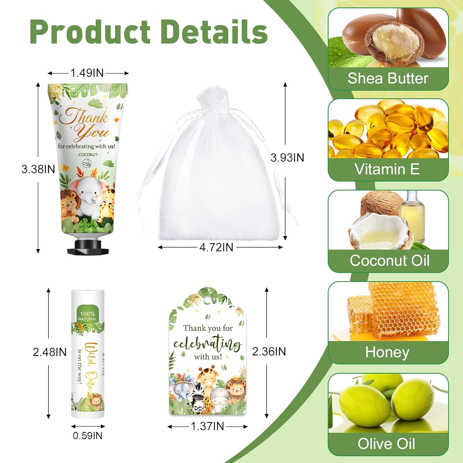 - 【50 Sets Baby Shower Hand Cream】This baby shower favors gifts set includes 50pcs hand cream with coconut scent,50pcs lip balms with coconut scent,50pcs organza gift bags,50pcs thank you cards and 1pcs operation instruction.Cute packaging,sufficient quantity,thank you to the guests who celebrated with you