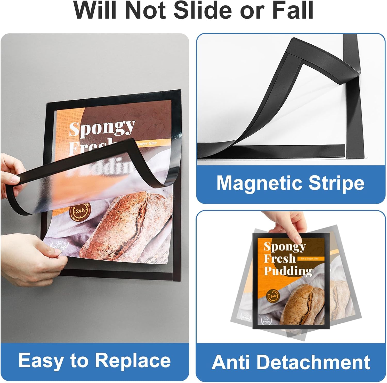 - ✔【Magnetic Frame is Easy to Replace】No tools or drilling are required. It is straightforward to use: just tear off the white protective film on the back, paste it on the smooth wall, open the front frame, and put in the notice/picture you want to display. The black magnetic borders can be attached. Perfect for businesses that need to swap and remove signs daily.
