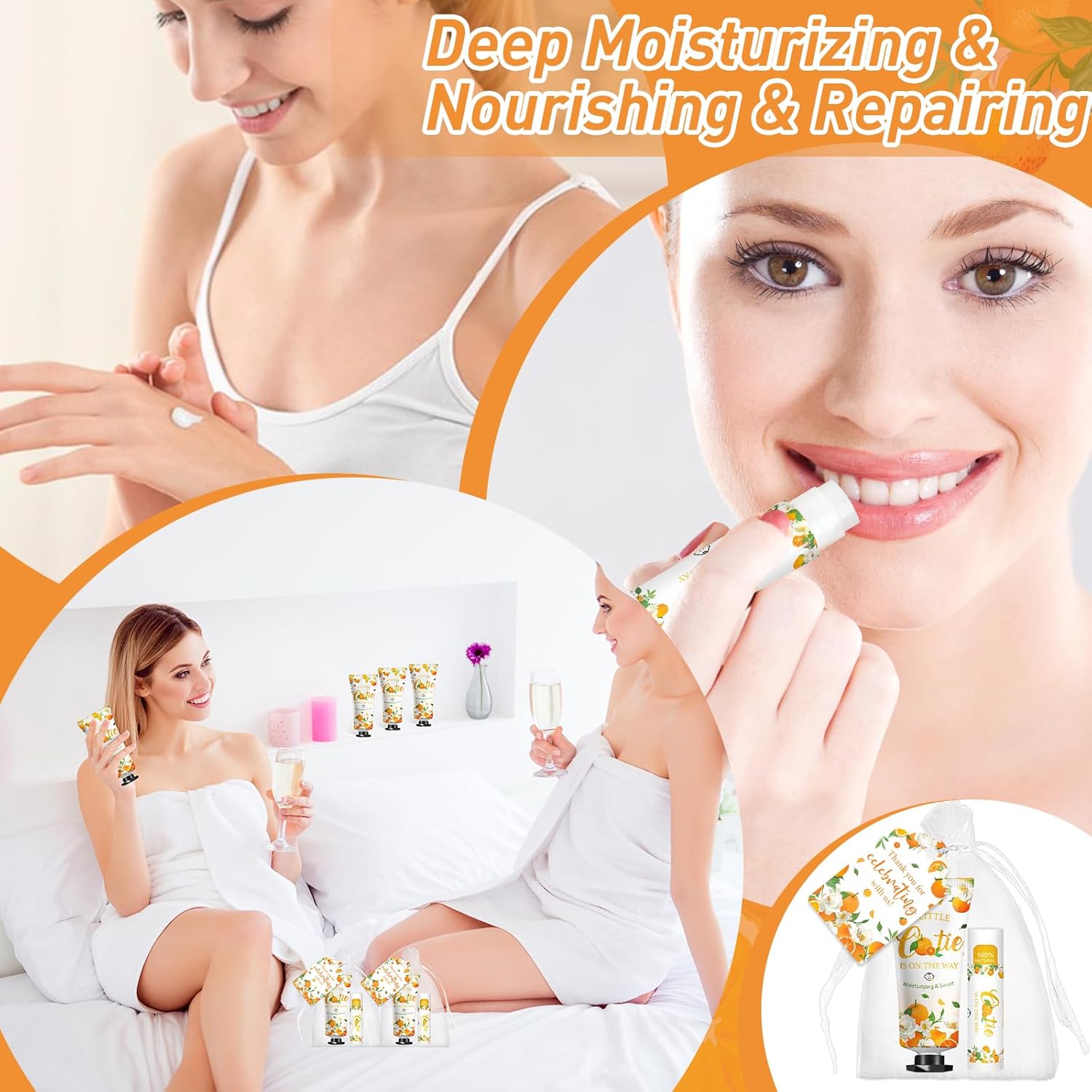 50 Pack Bulk Hand Cream and Bulk Lip Balm Gifts Sets, Bridal Shower Favors and Baby Shower Favors for Guests with Thank You Card and Organza Gift Bags, Appreciation Gifts, Baby Shower Prizes (Orange)