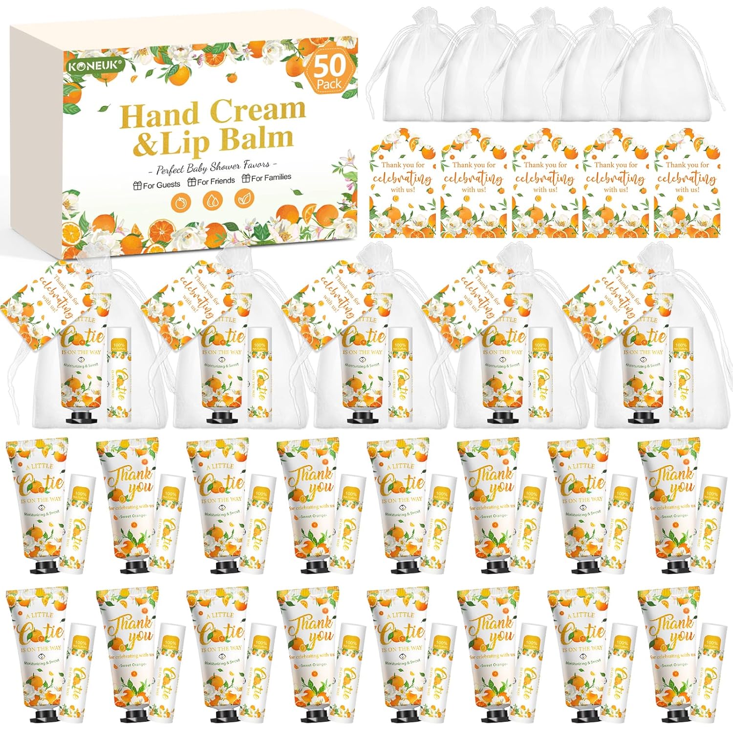 - 【50 Sets Baby Shower Hand Cream】This baby shower favors gifts set includes 50pcs hand cream with orange scent,50pcs lip balms with orange scent,50pcs organza gift bags,50pcs thank you cards and 1pcs operation instruction.Cute packaging,sufficient quantity,thank you to the guests who celebrated with you
