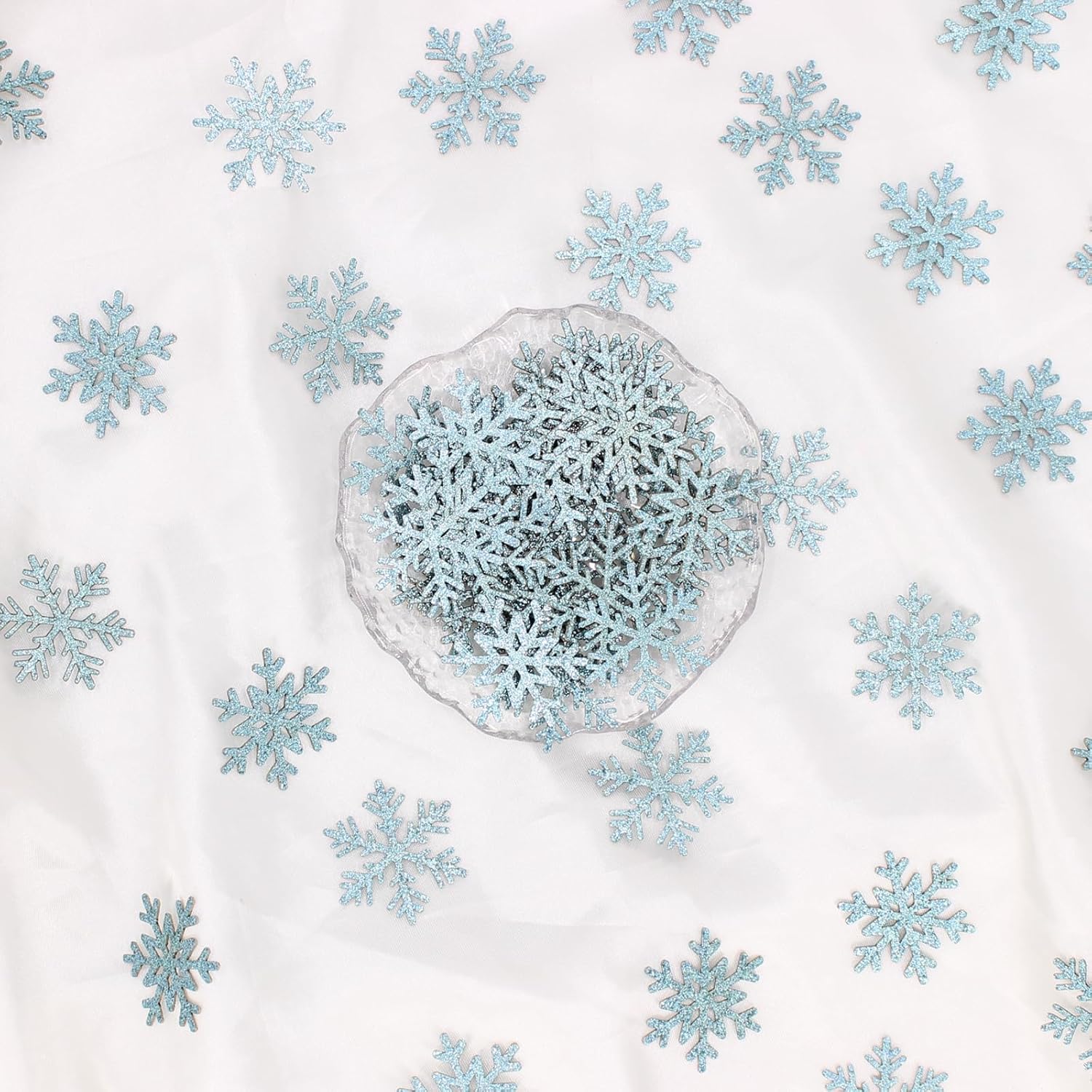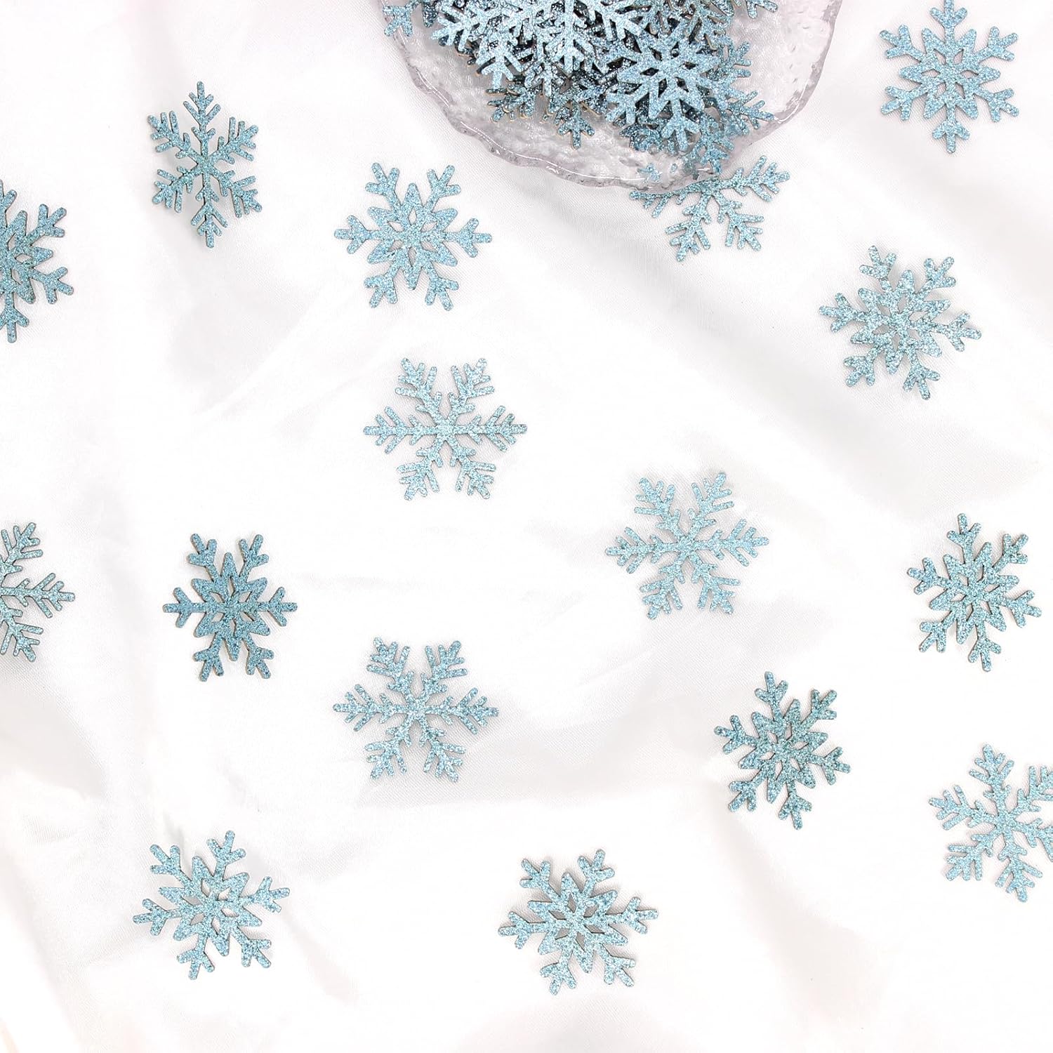 - Premium quality,proper size.The small snowflakes for crafts are made from premium glittery paper card and well cut,the blue color confetti is super shine.The snowflake decor size is 1.2inch,perfect for holiday crafts,recommend as table decorations or craft supply.