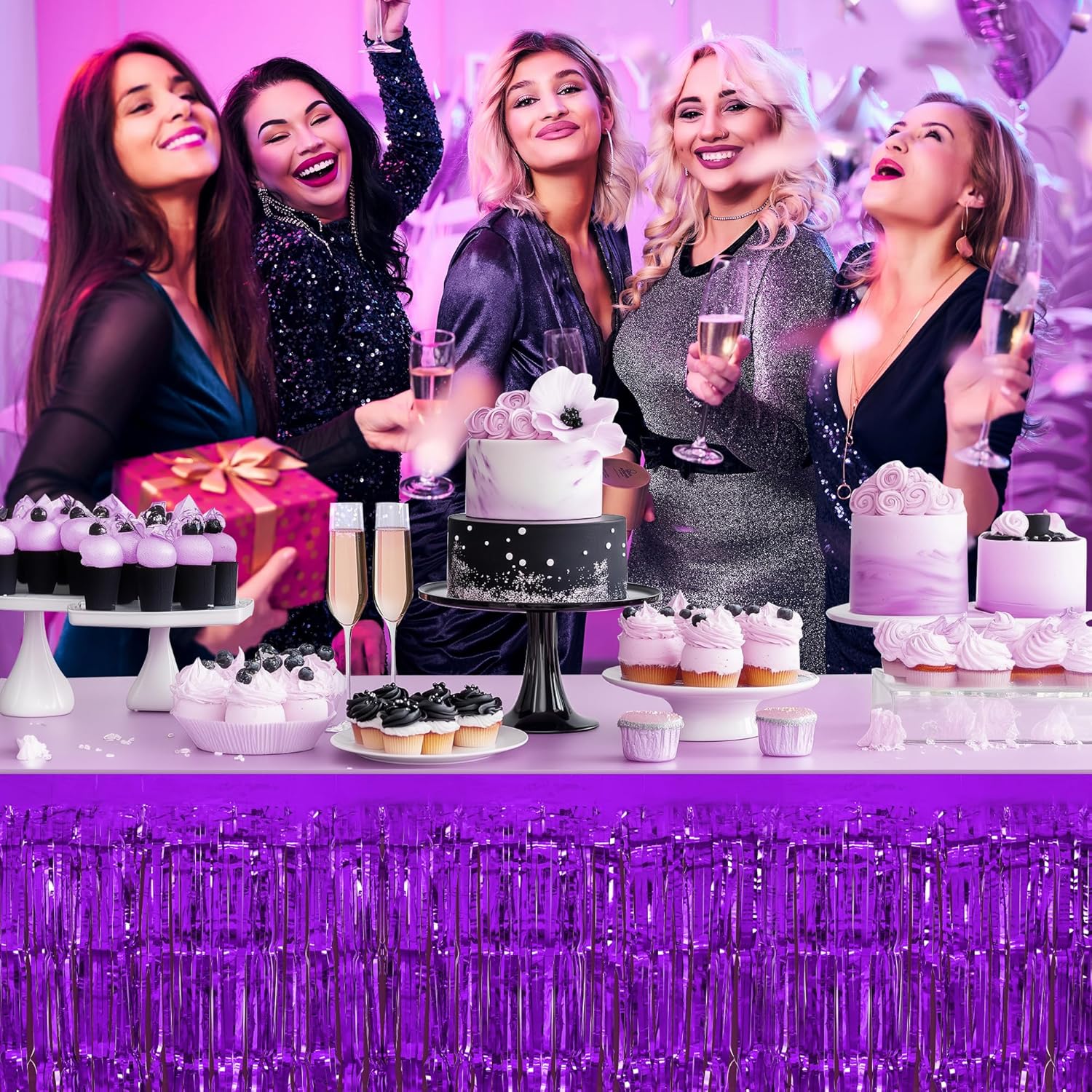 2 Pack Dark Purple Table Skirts, 29x108" Metallic Foil Tinsel Fringe Table Skirts for Rectangle Tables Streamer Curtains Backdrop, Party Decorations for Birthdays Weddings Holidays