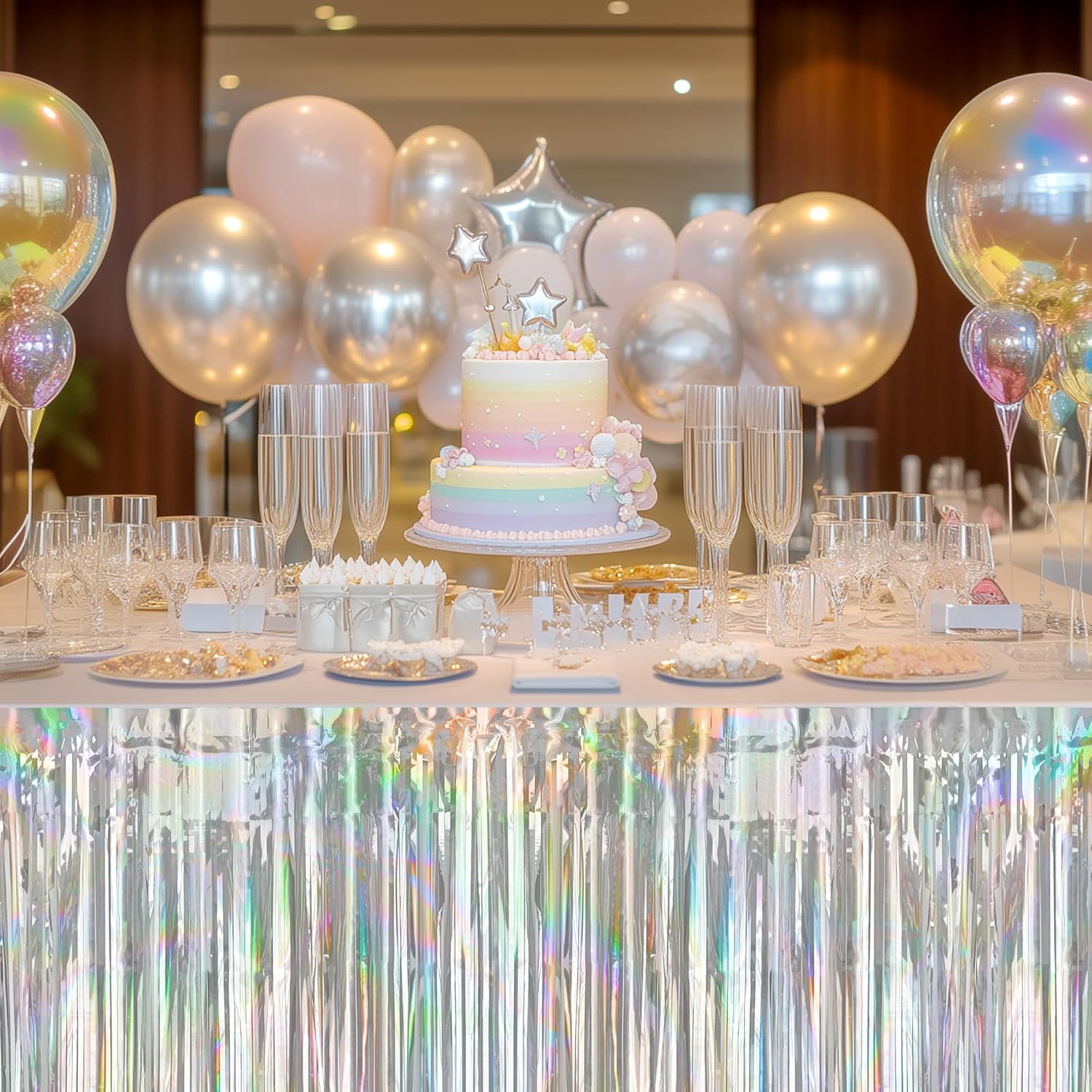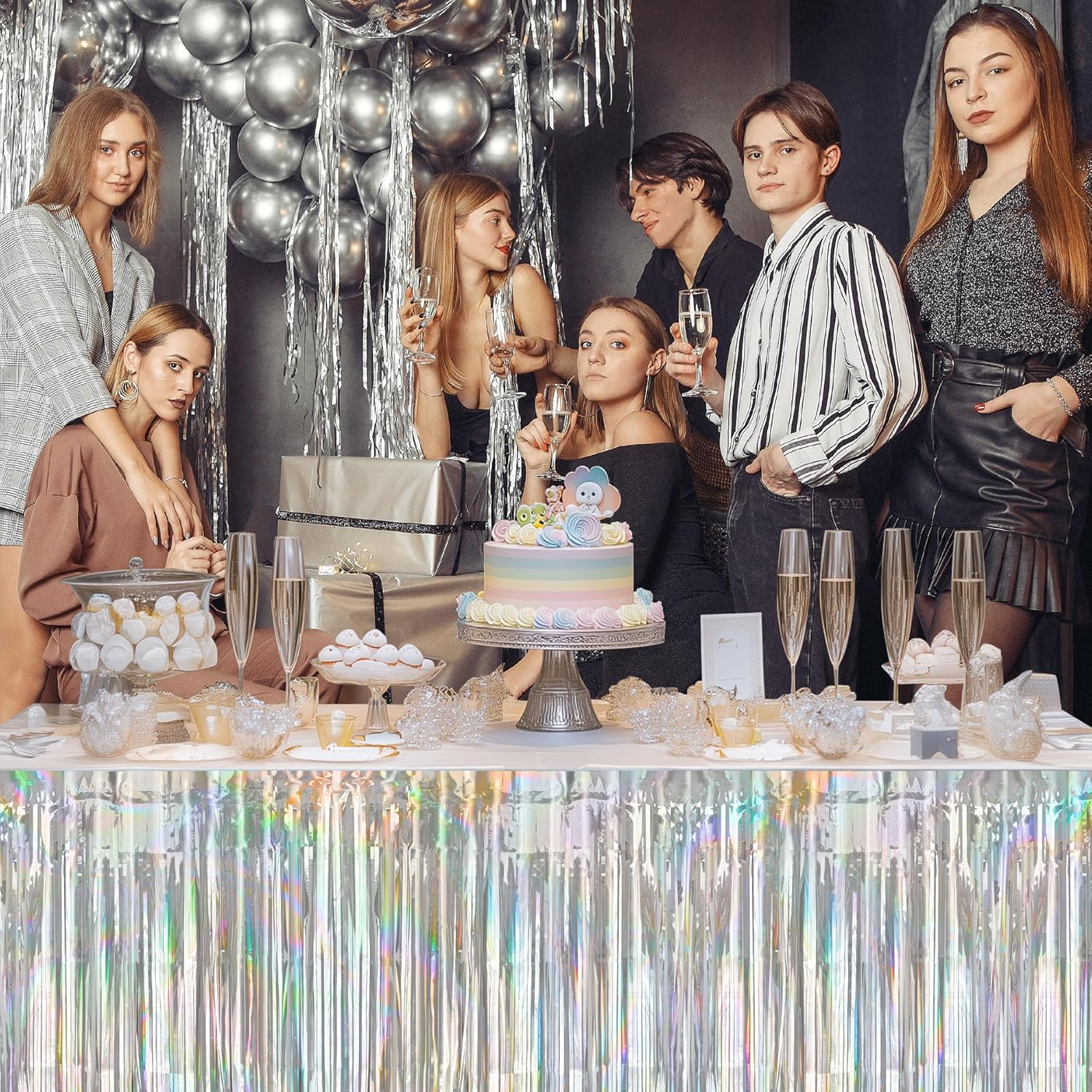 2 Pack Laser Silver Table Skirts, 29x108" Metallic Foil Tinsel Fringe Table Skirts for Rectangle Tables Streamer Curtains Backdrop, Party Decorations for Birthdays Weddings Holidays