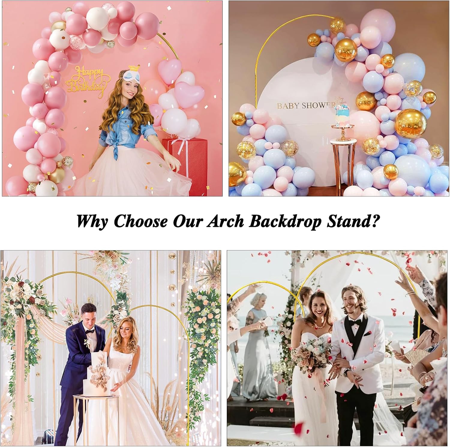 - 【Sturdy and Stable Base】: This arched golden arch holder has a horizontal bar on the base, which is fixed with two golden water bags to make the arch more stable. Adding some decorative elements to the base can also improve stability