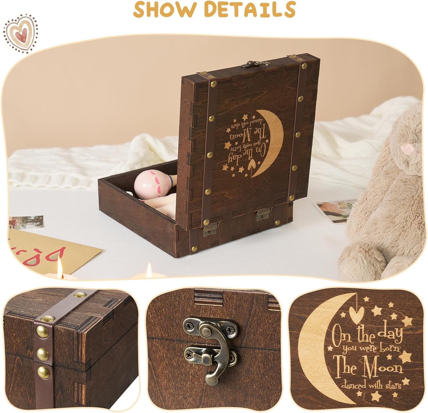 - 【Cute Design for Baby】Engraved text and cute moon on the outside lid, decorated with dark brown PU leather and rivet, vintage and novelty, a sturdy latch for security. Our beautifully engraved box is a sweet way to share your love to baby.