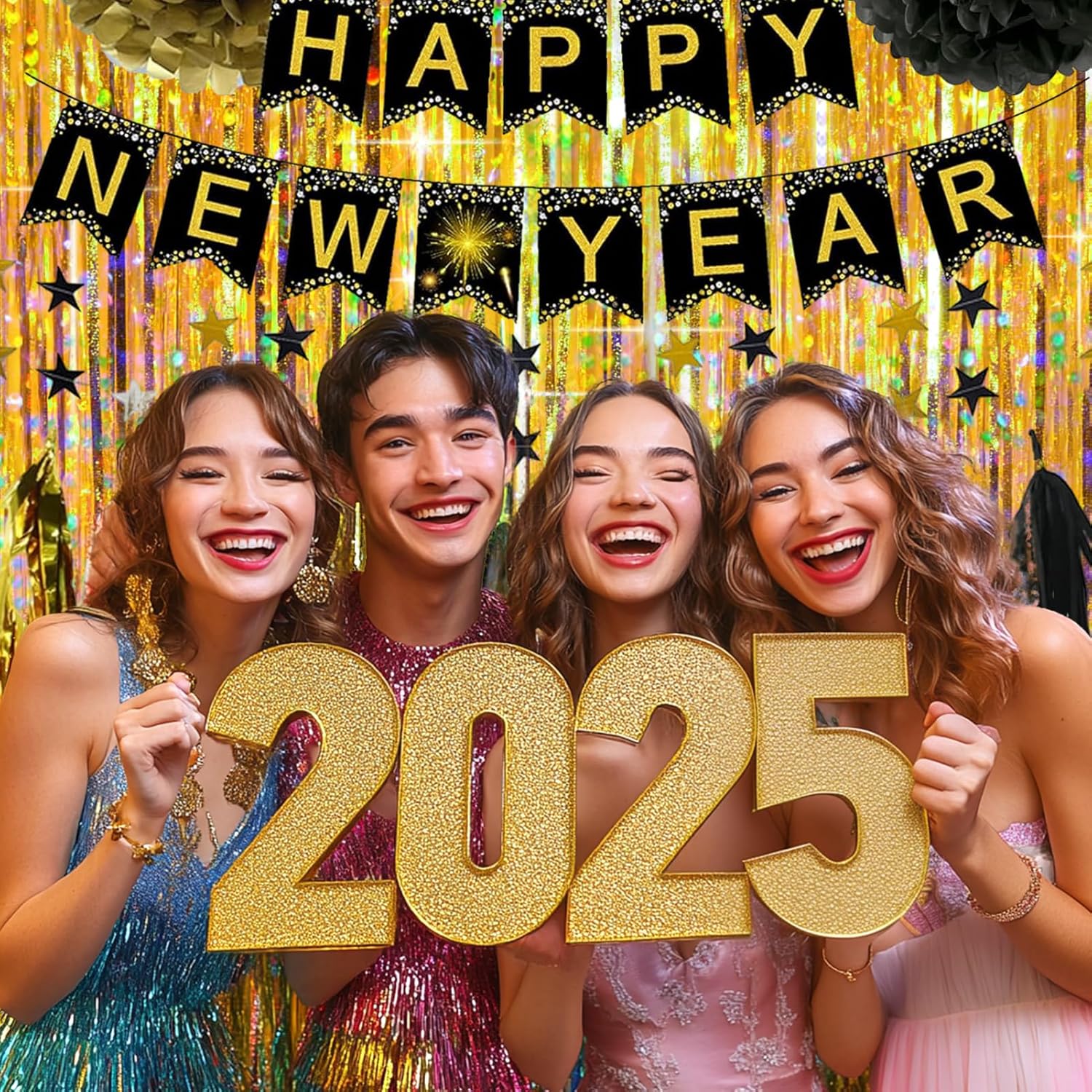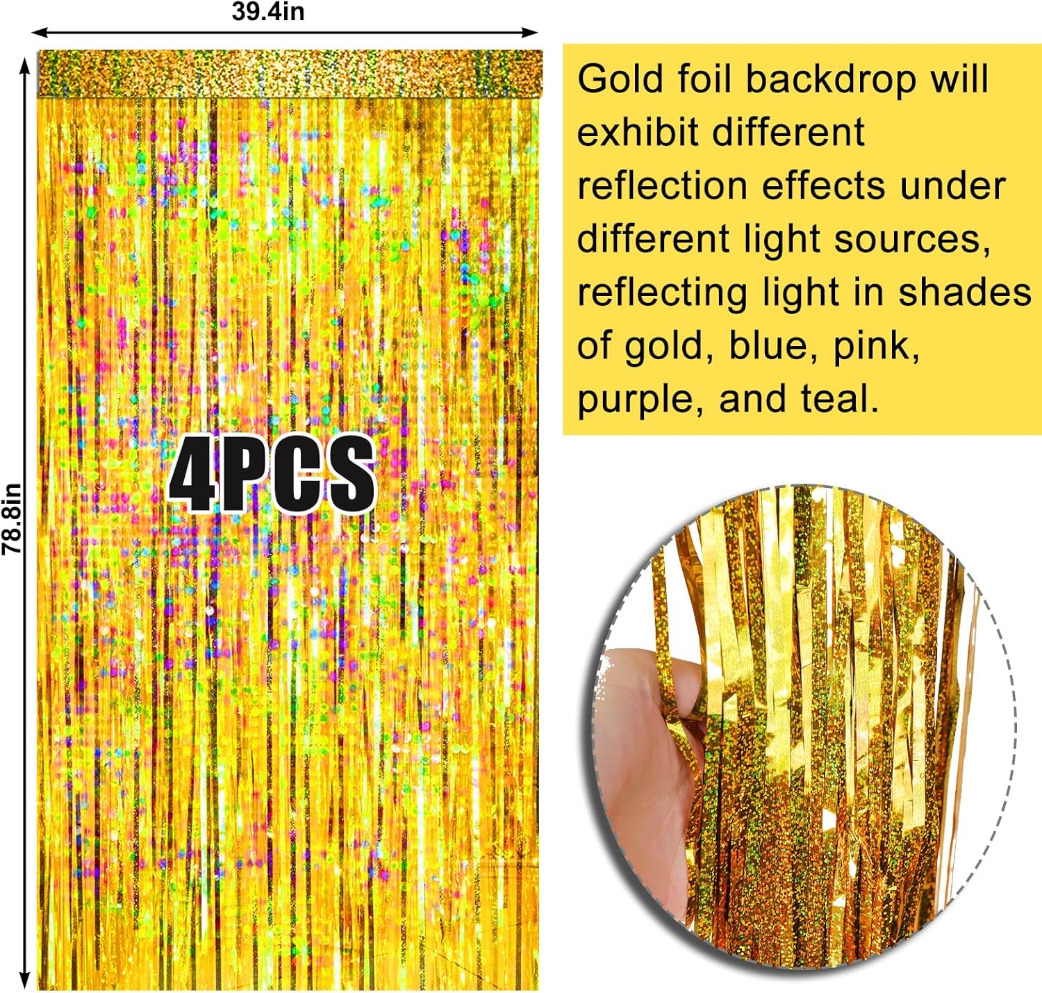 - Shimmery Gold Fringe Backdrop: You will get 4 Pcs gold glitter tinsel backdrop. Size: 6.6ft*3.3ft. The foil fringe curtains are perfect for the door or wall to create an impressive decoration for parties, events, and photo booths.